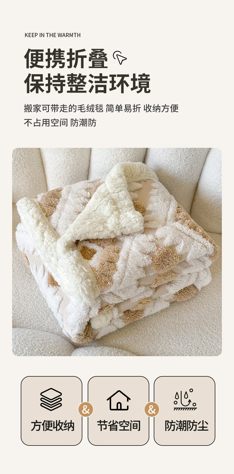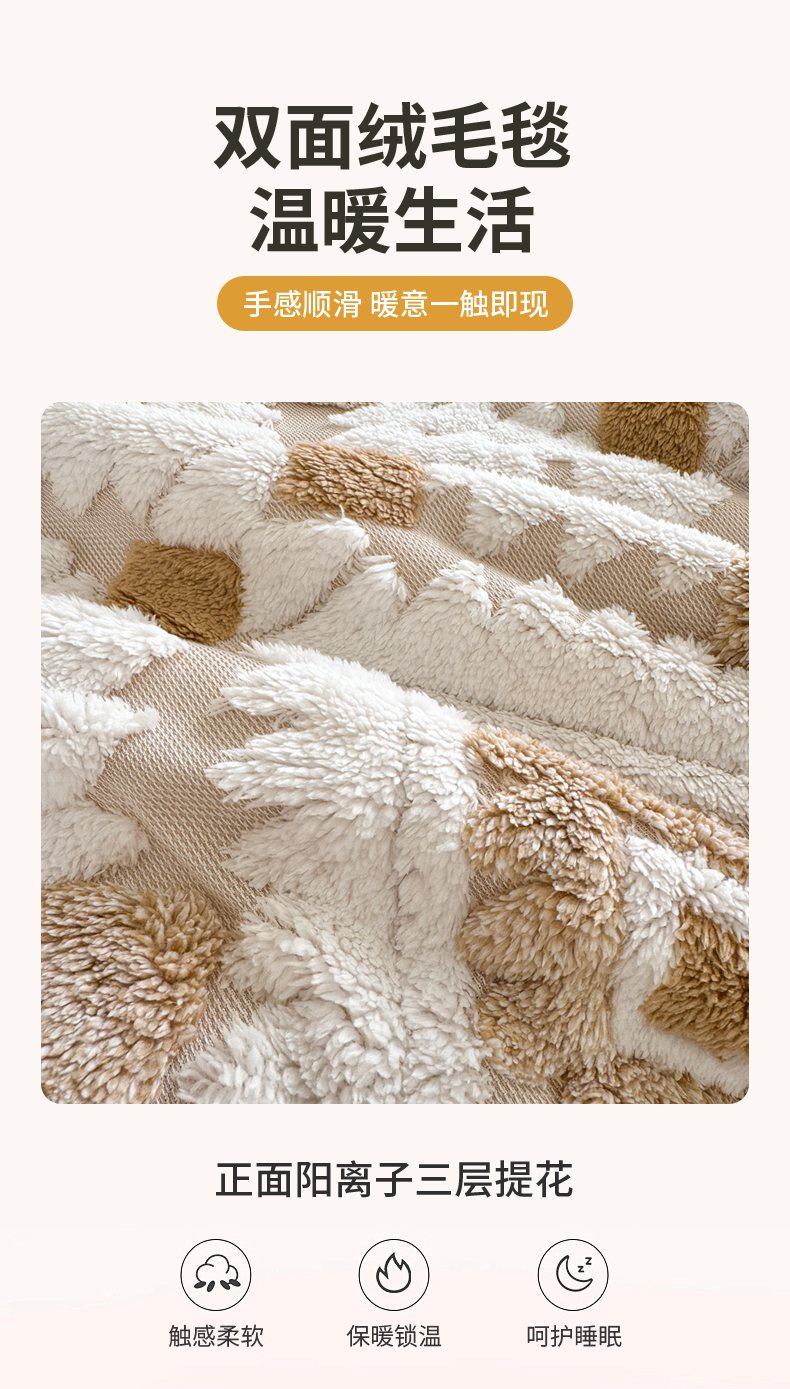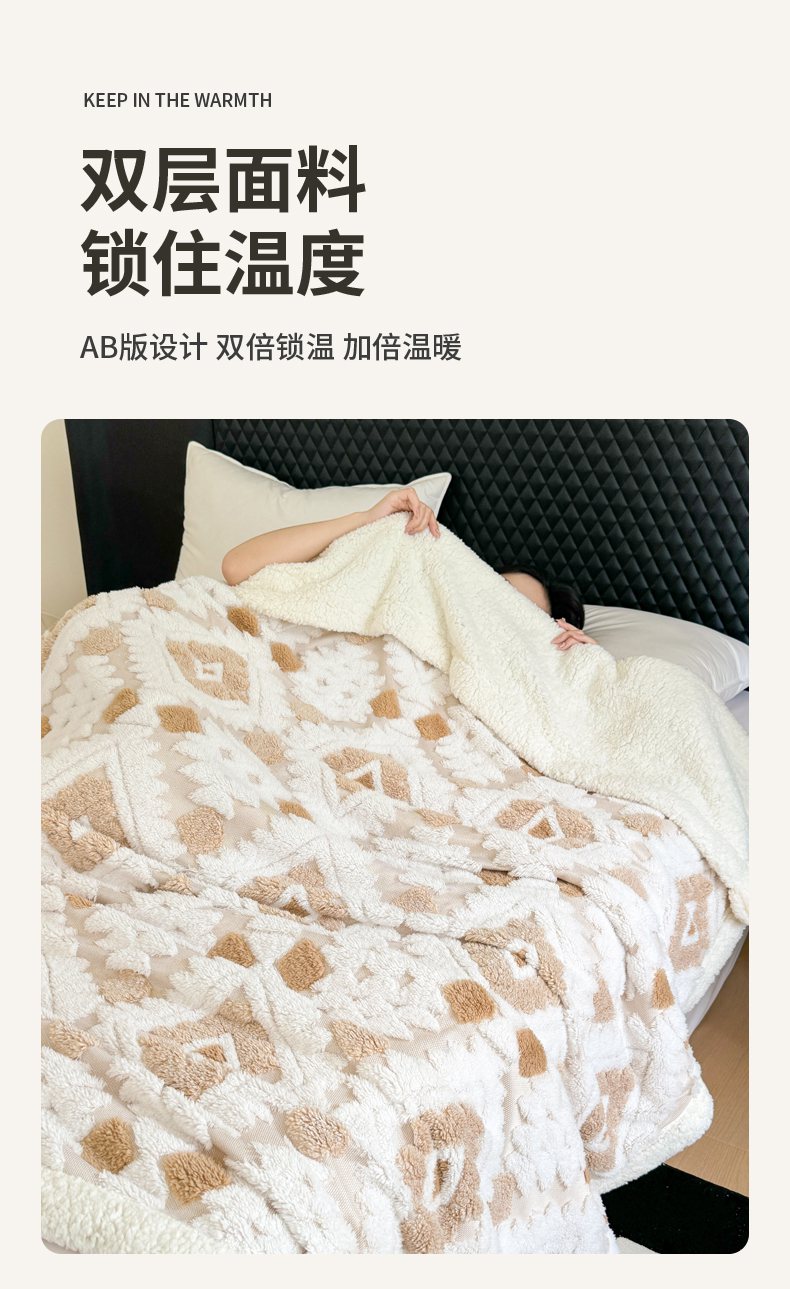 商品名称:梵克保罗 2025新款轻奢阳离子提花镂空塔芙绒羊羔绒保暖午睡双层毛毯办公室盖毯 驼色