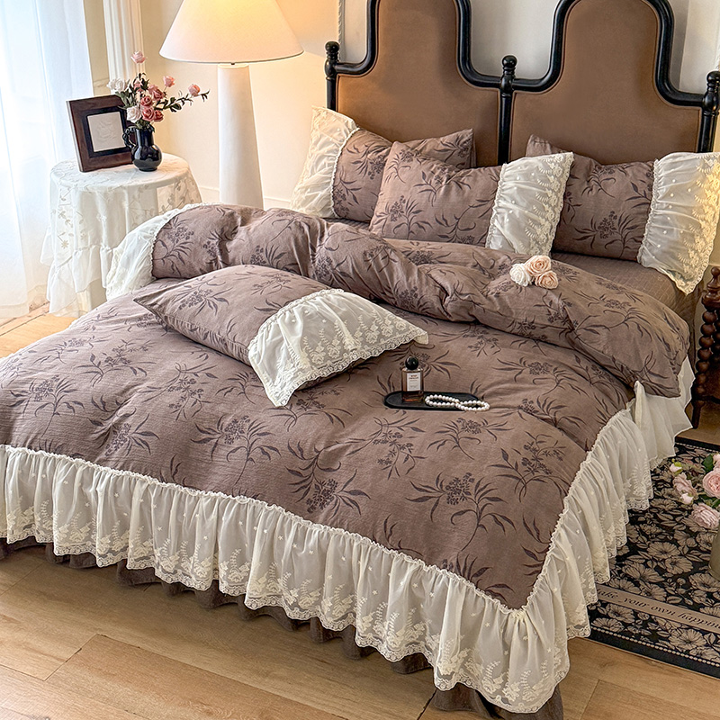 苏米娜2025秋冬新款法式复古双层花边大蕾丝水洗棉亚麻床盖款四件套全棉纯棉印花小碎花四件套 金枝玉叶