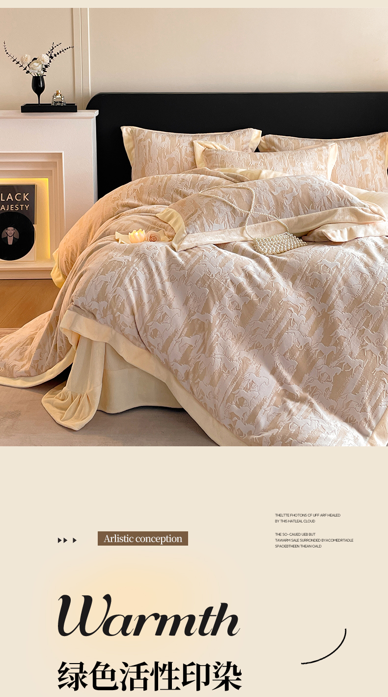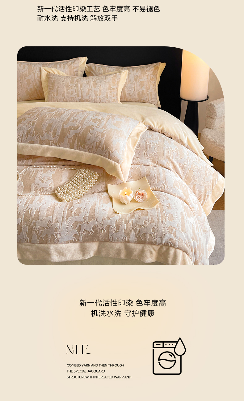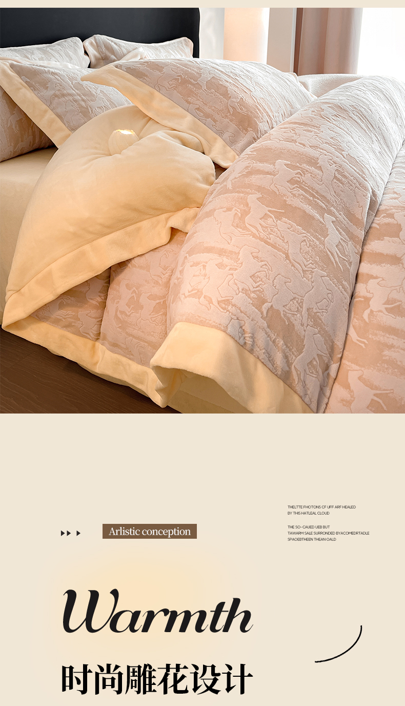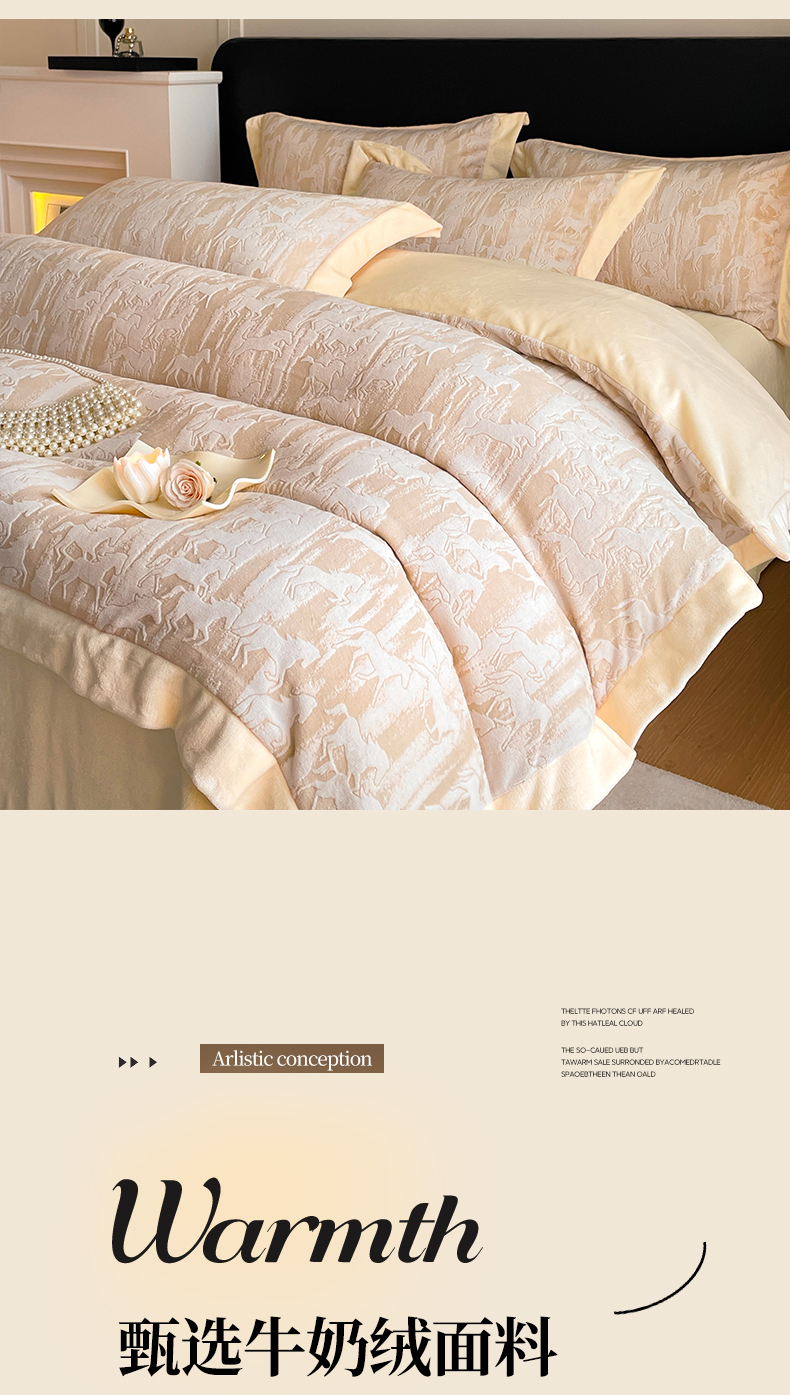 商品名称:民新家纺 2025新款牛奶绒宽包边雕花四件套 英伦骑士-浅米咖