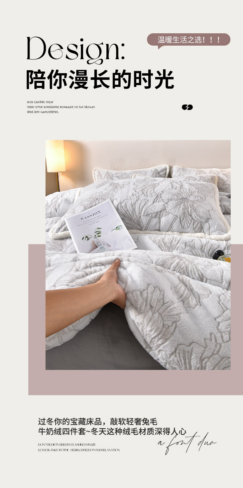 吾诺家居 320克深雕兔毛绒四件套牛奶绒四件套兔毛四件套 兔毛包边四件套 恋恋花语
