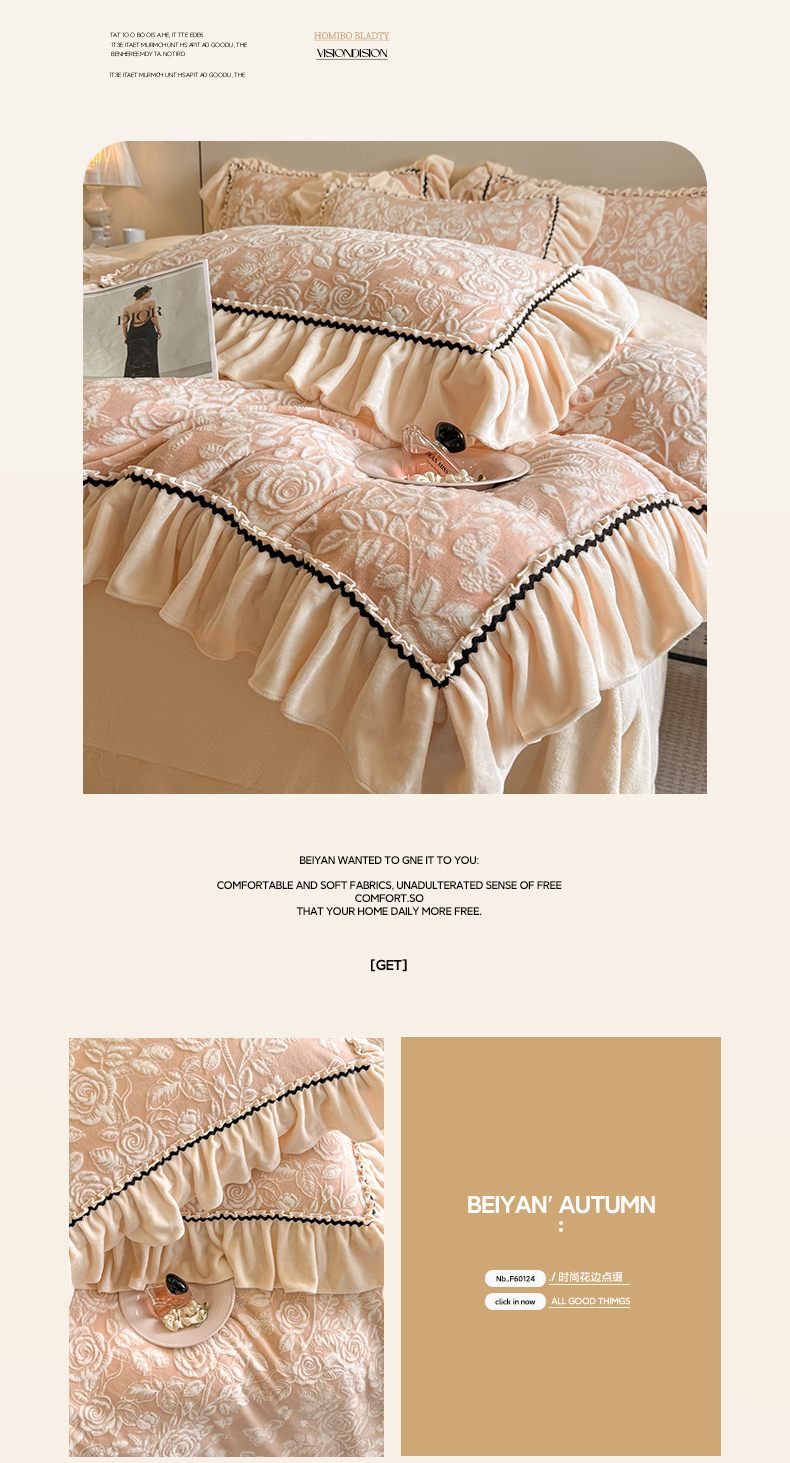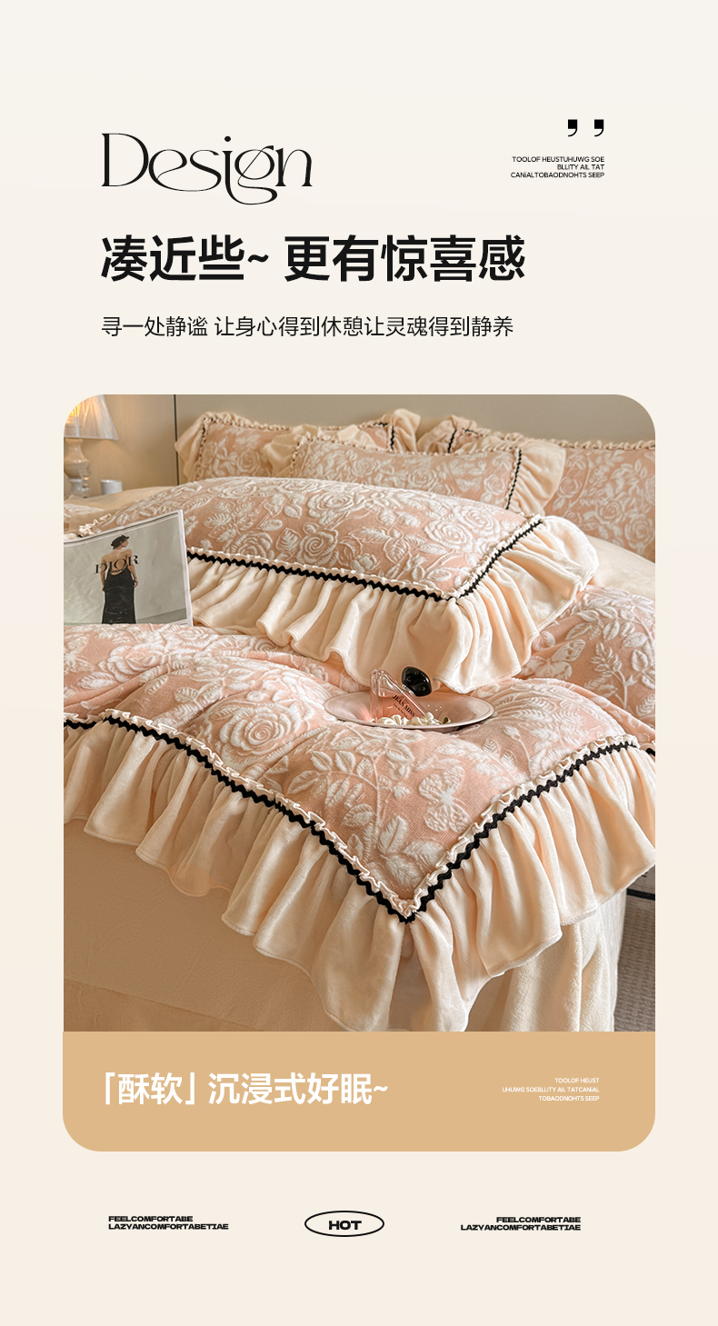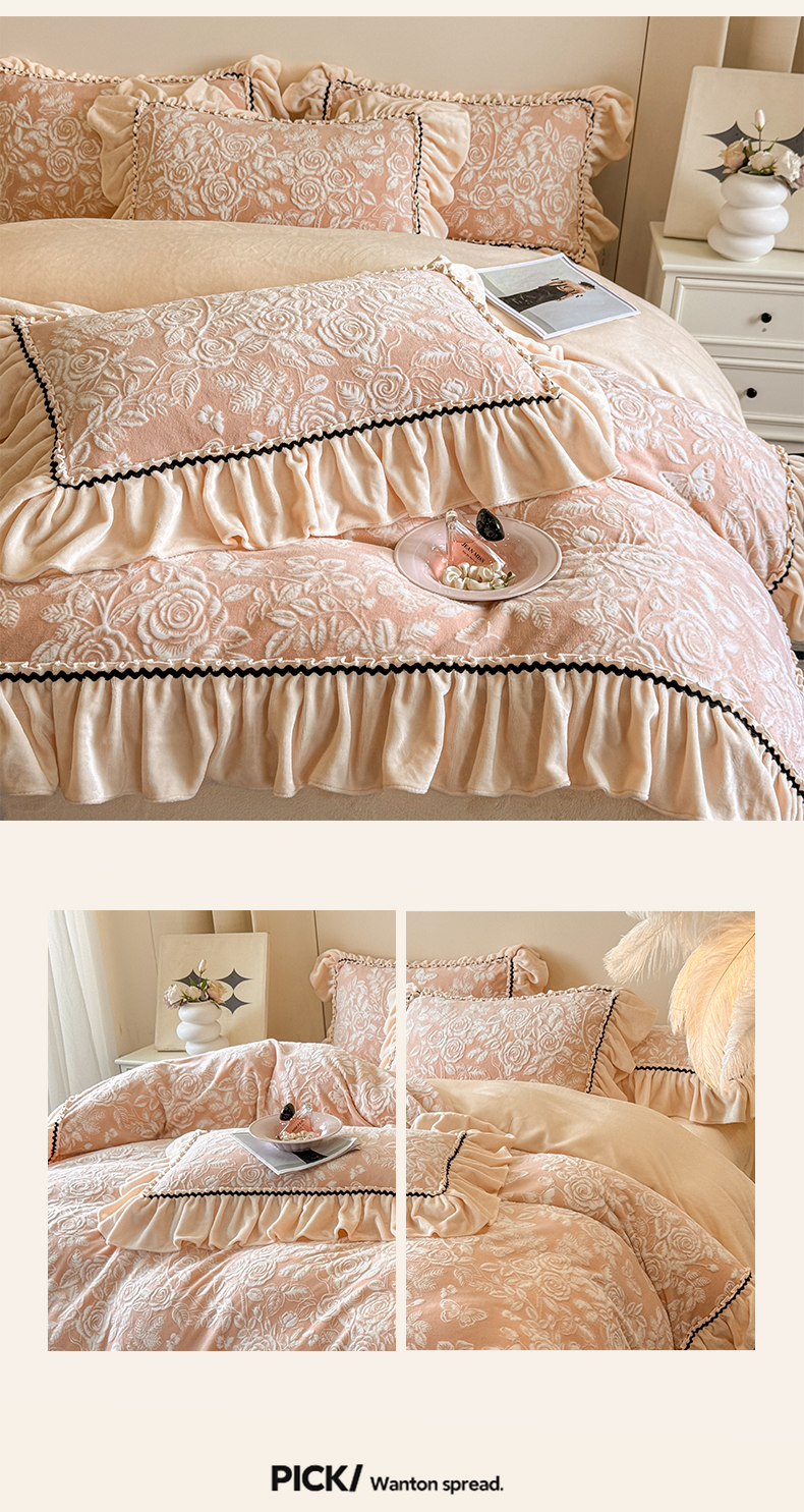 商品名称:畅畅家纺 2025新款轻奢高档烂花牛奶绒花边款四件套 蝶恋花 -暖粉
