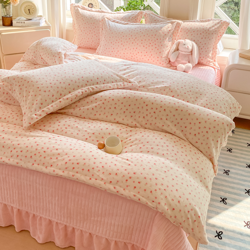 商品名称:梦可莱家居 2025冬新款牛奶绒加厚保暖花边床盖四件套系列简单款 双拼蝴蝶粉