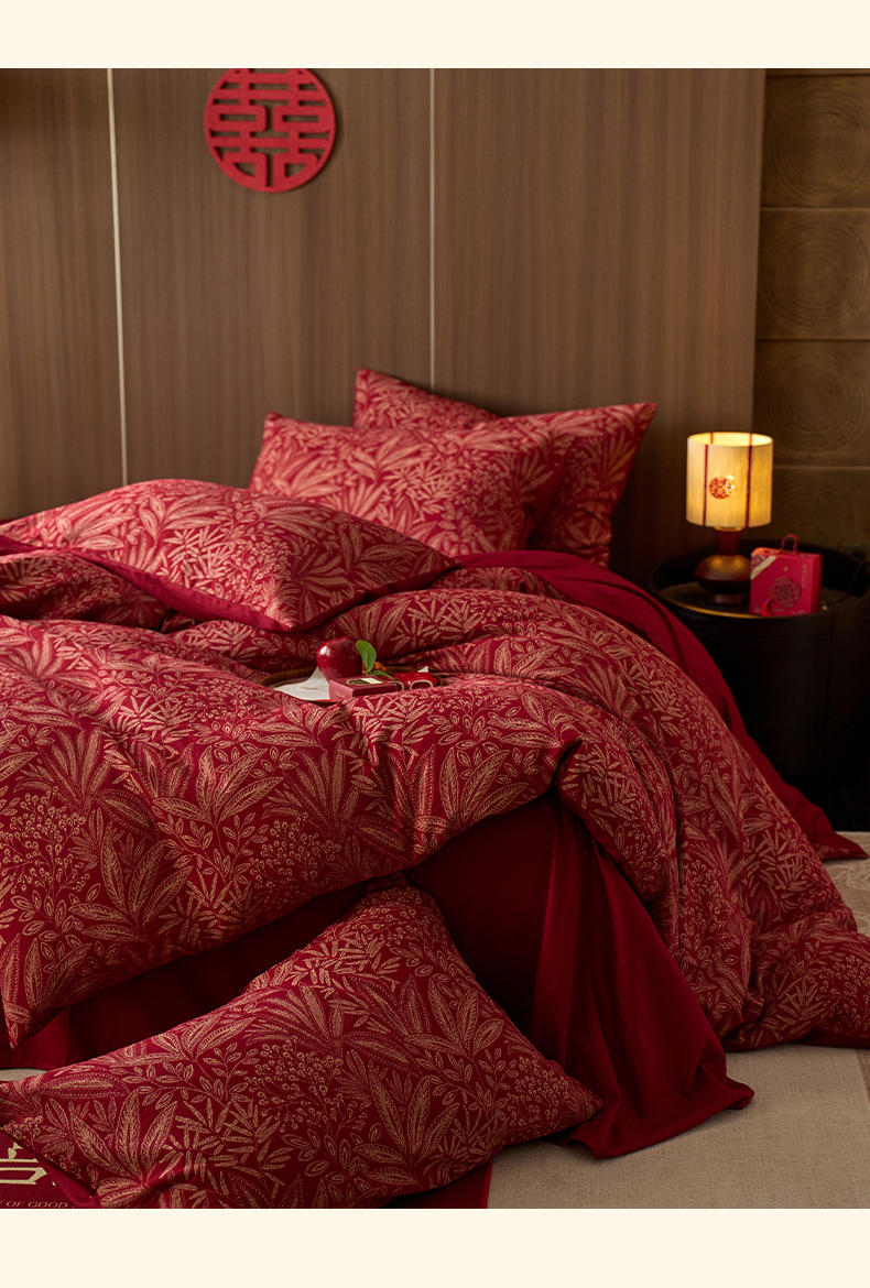 千朵森 2025新款全棉色织提花大红婚庆四件套 叶语传喜