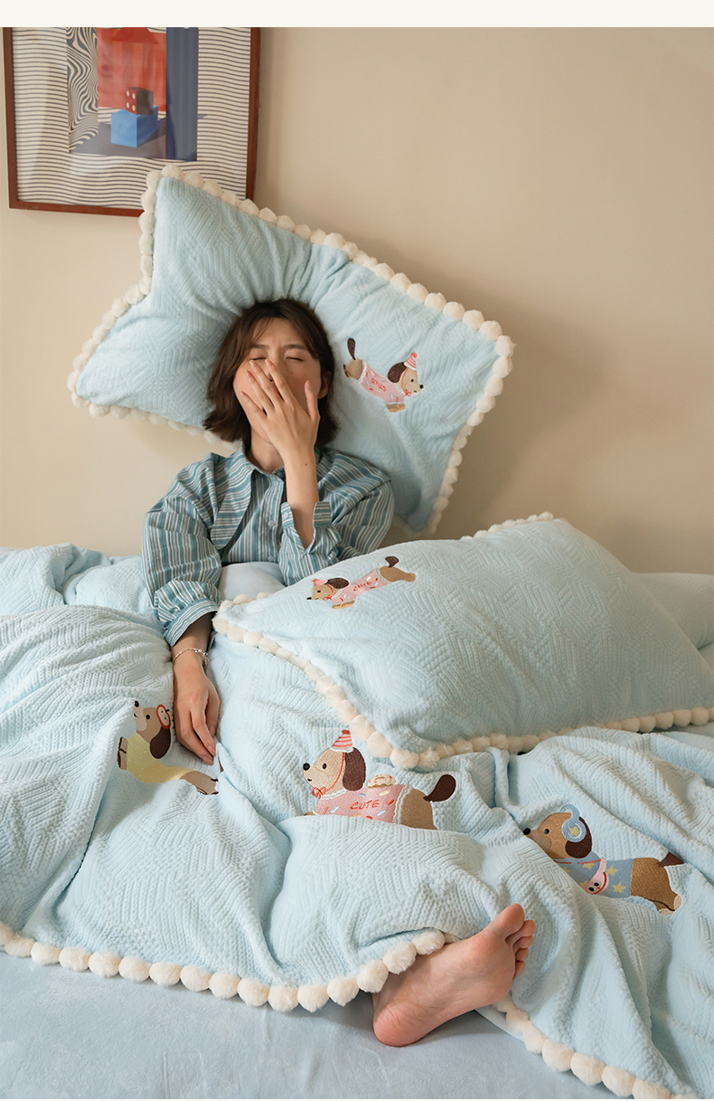 圆岛家纺 2025新款针织肌理纹雕花立体牛奶绒刺绣四件套 小懒猫