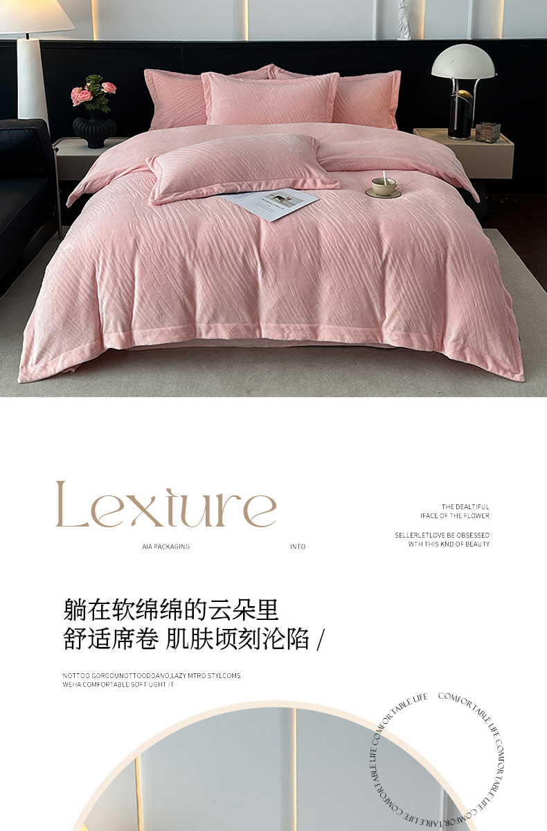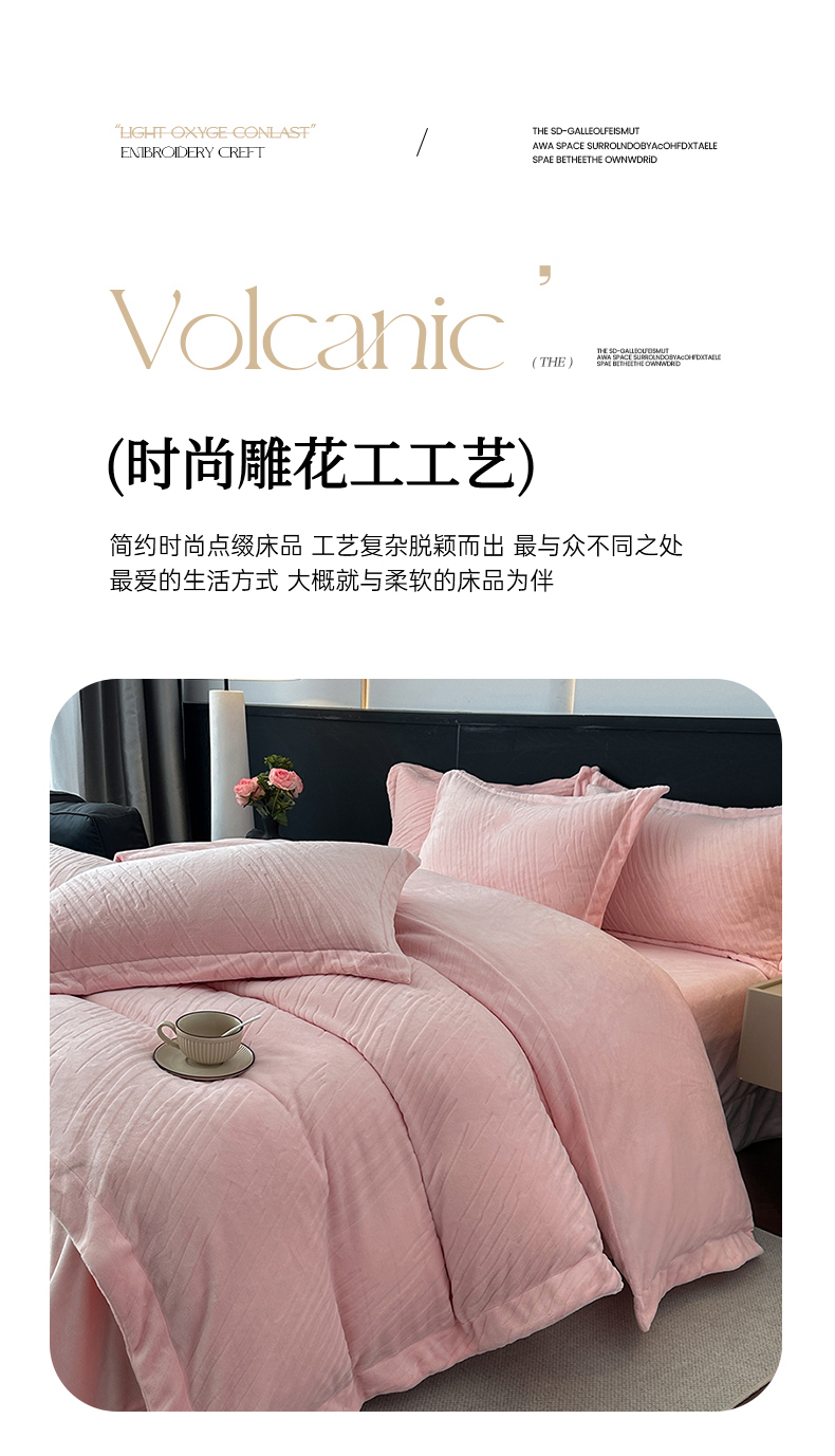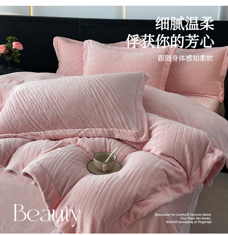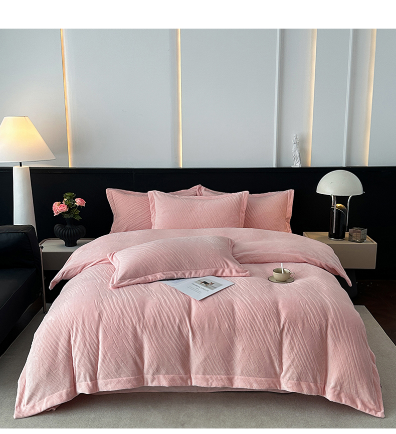 (总)乐嘉盈 2025年新款纯色雕花牛奶绒四件套,粉色