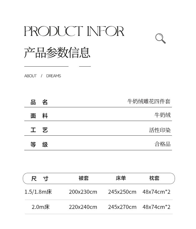 加大床单四件套:被套220*240cm,床单250*270cm,枕套48*74cm
