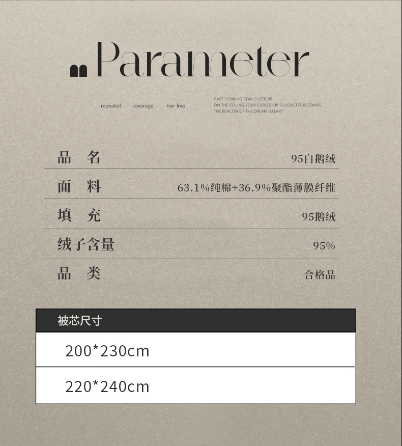 220-240 填充1200克95白鹅绒 秋冬被 | ¥2000.00 |