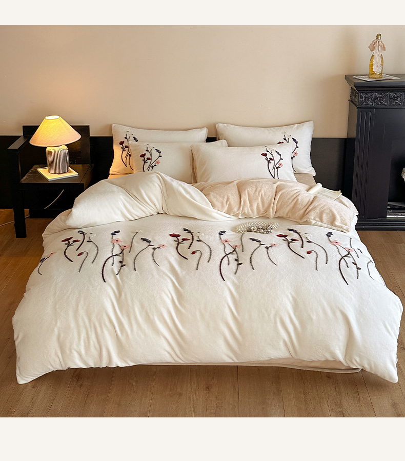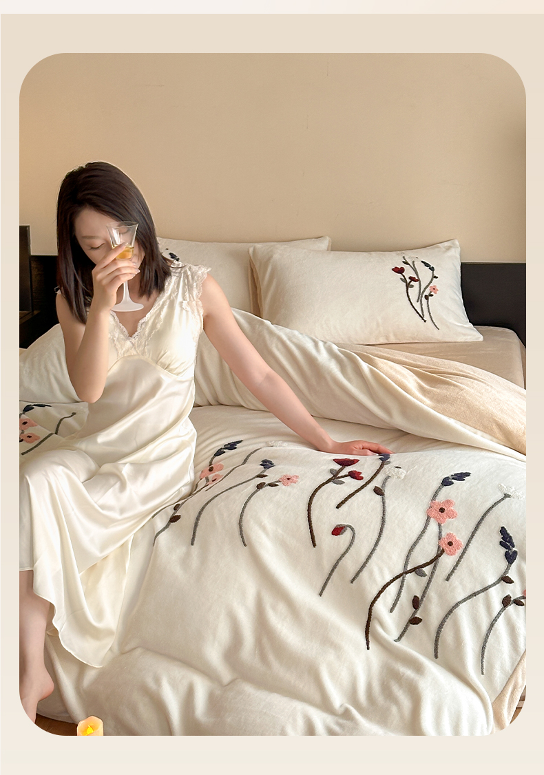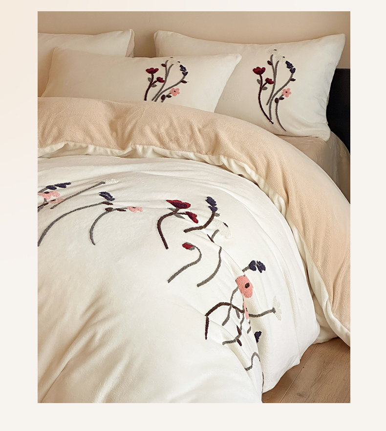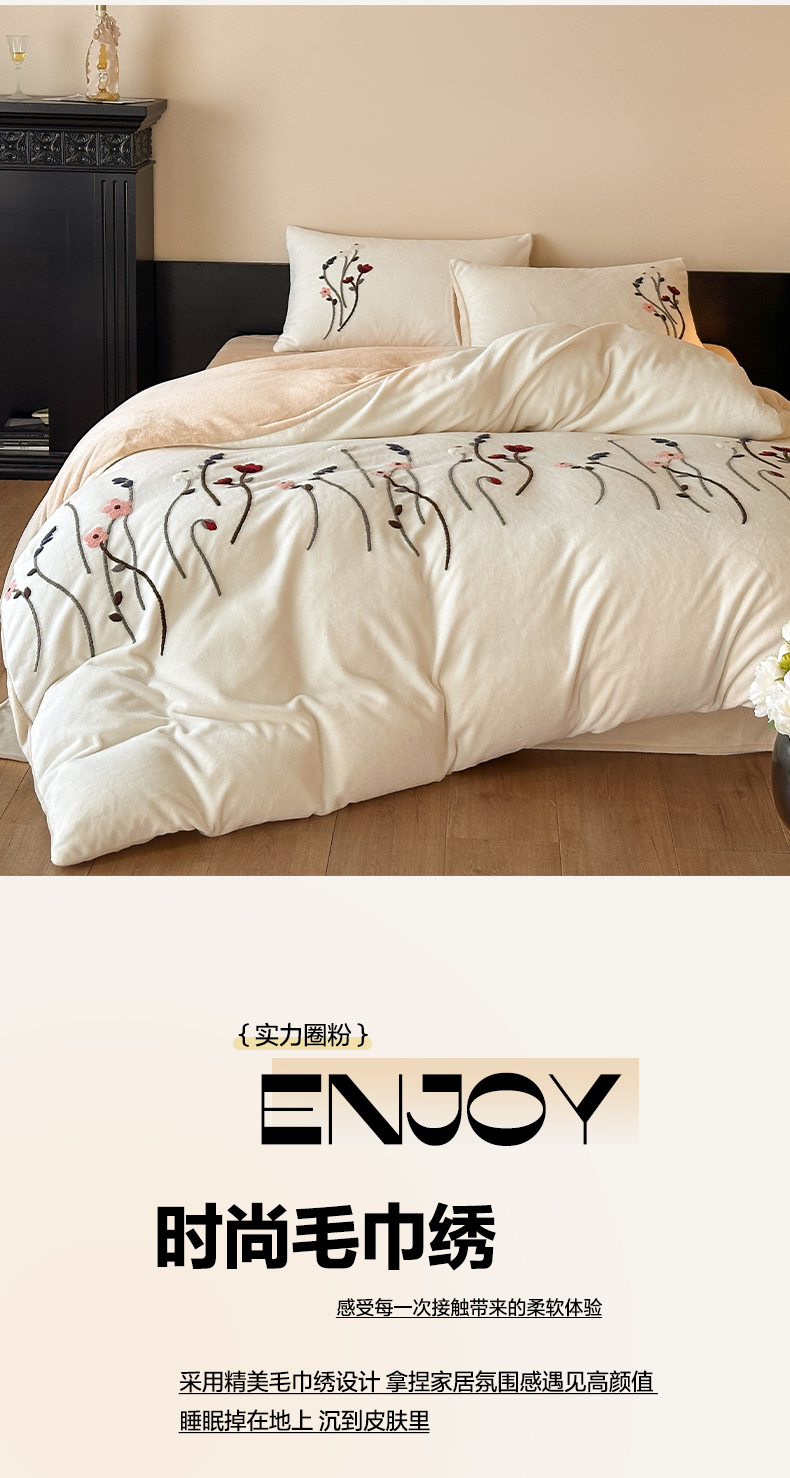 如一 2025新款田园风毛巾绣牛奶绒四件套 幽兰-白咖