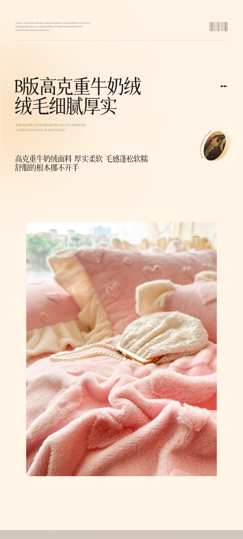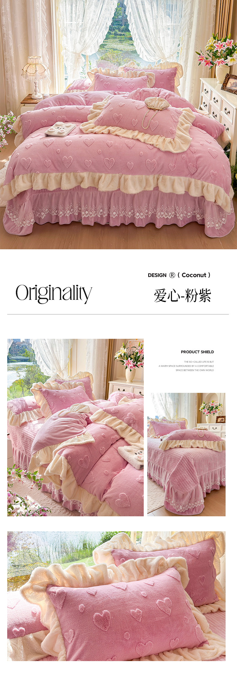 (总)宜凡家纺 2025新款兔绒提花牛奶绒夹棉床裙四件套,爱心 少女粉,爱心 粉紫,爱心 驼色,蝶舞 大红,蝶舞 米色,蝶舞 浅紫,蝶舞 玉色,简爱 苍青,简爱 豆沙紫,简爱 玉色,樱桃 苍青,樱桃 豆沙紫,樱桃 奶油白