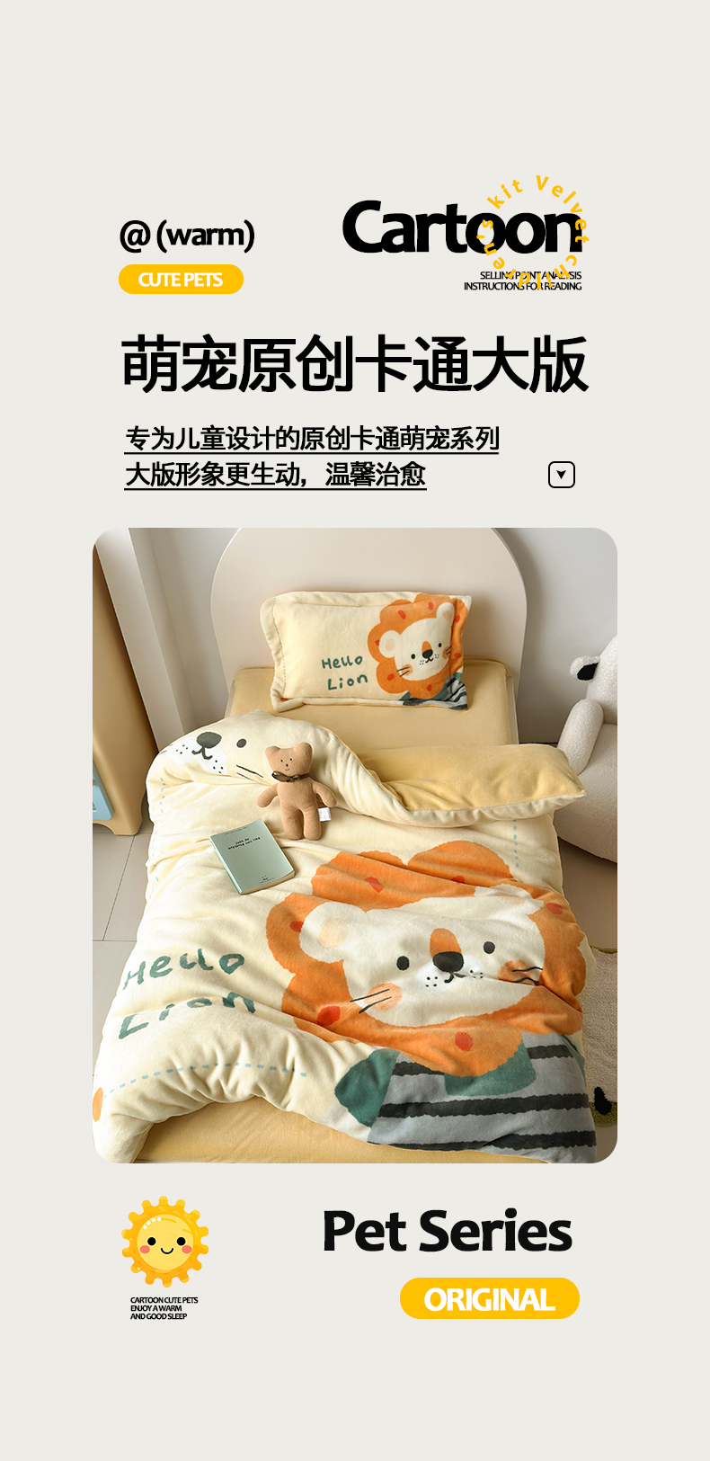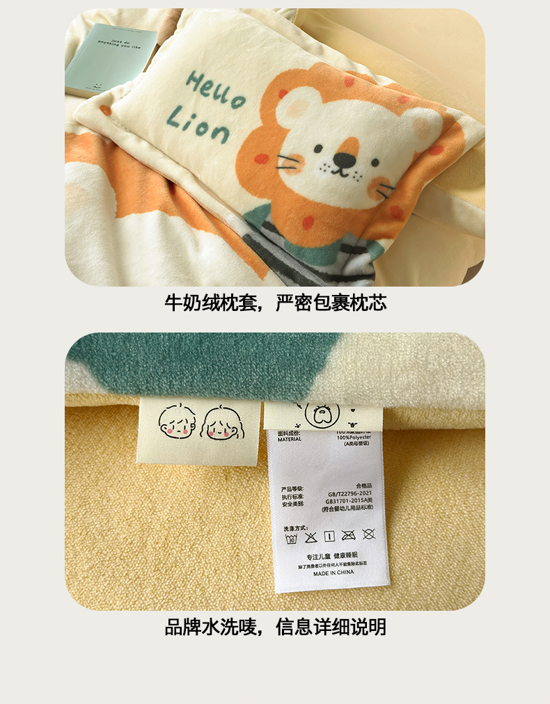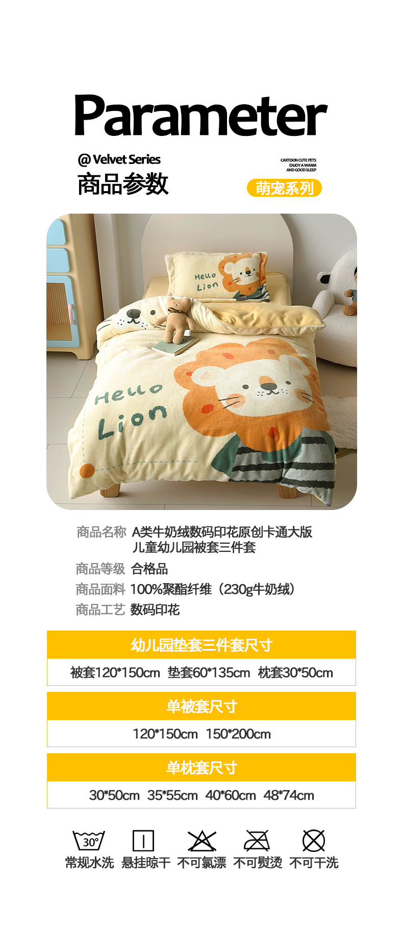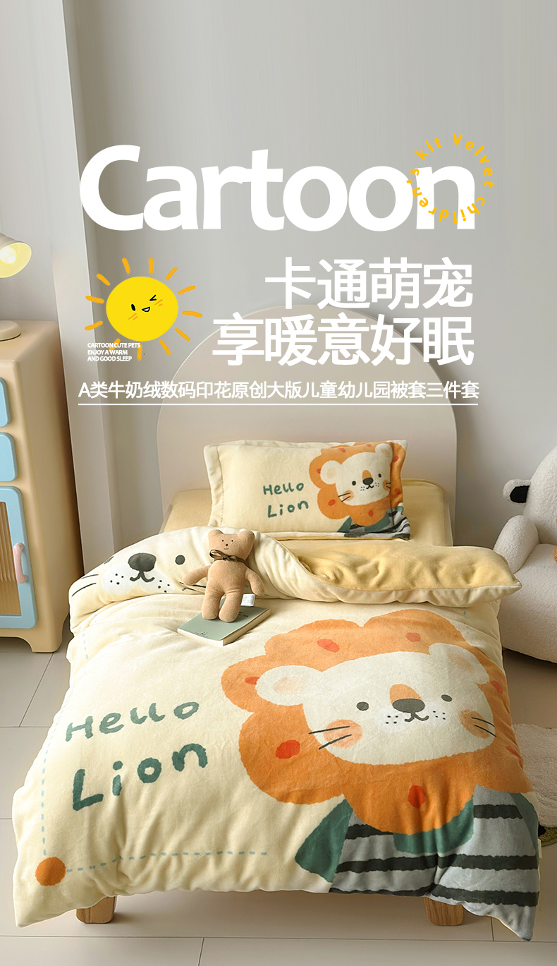 当前位置: 91家纺网 > 商品网购 > 床品套件 > 三件套 > 荷马之梦 2025新款A类牛奶绒数码印花原创卡通大版儿童幼儿园被套三件套-萌宠系列 小狮子王