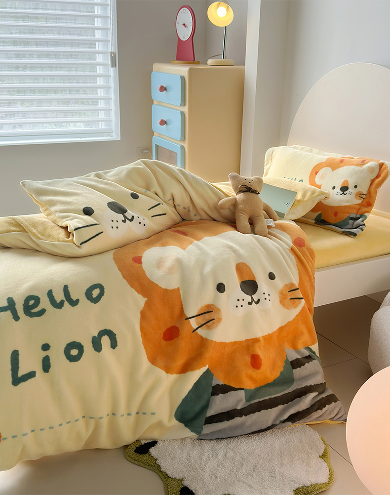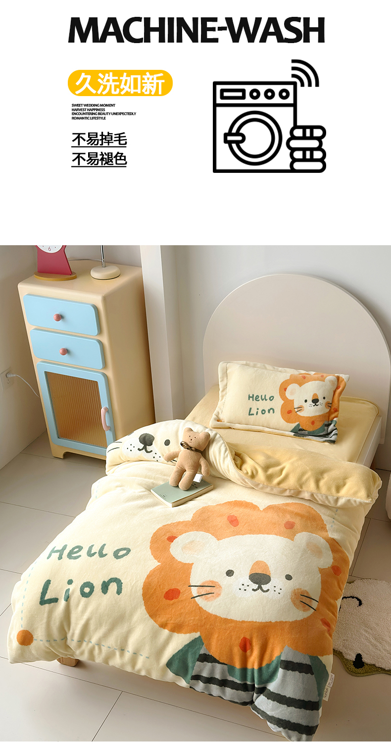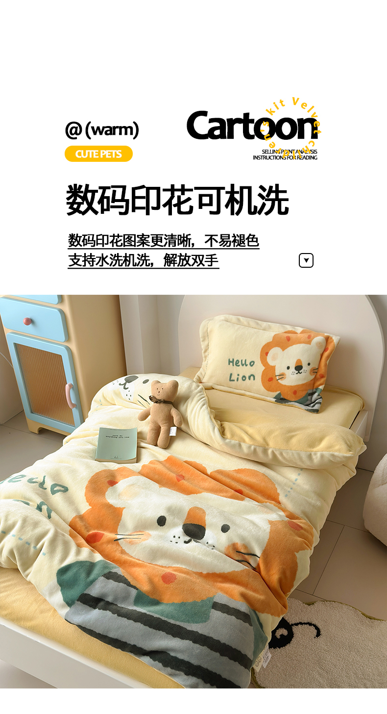 当前位置: 91家纺网 > 商品网购 > 床品套件 > 三件套 > 荷马之梦 2025新款A类牛奶绒数码印花原创卡通大版儿童幼儿园被套三件套-萌宠系列 小狮子王