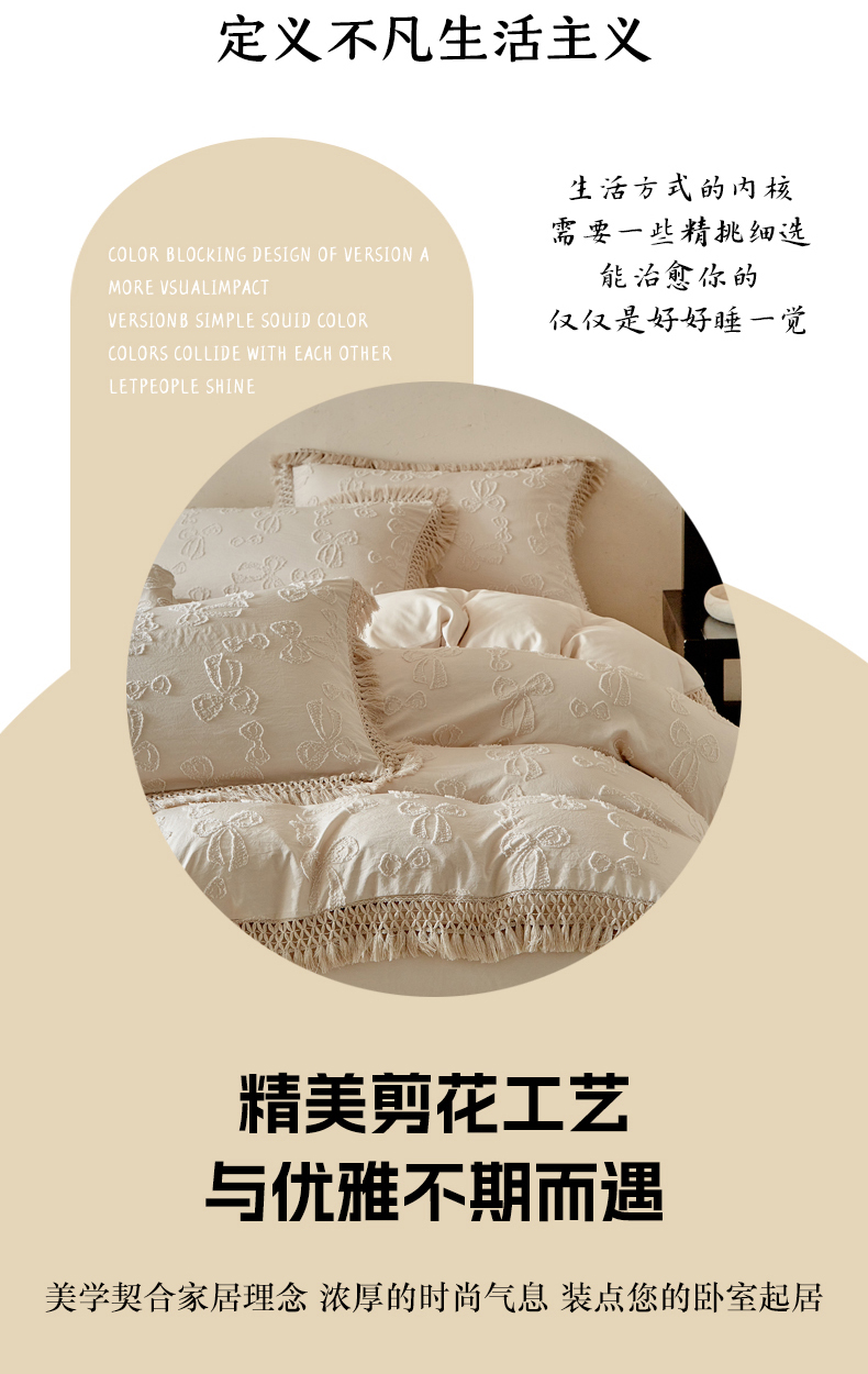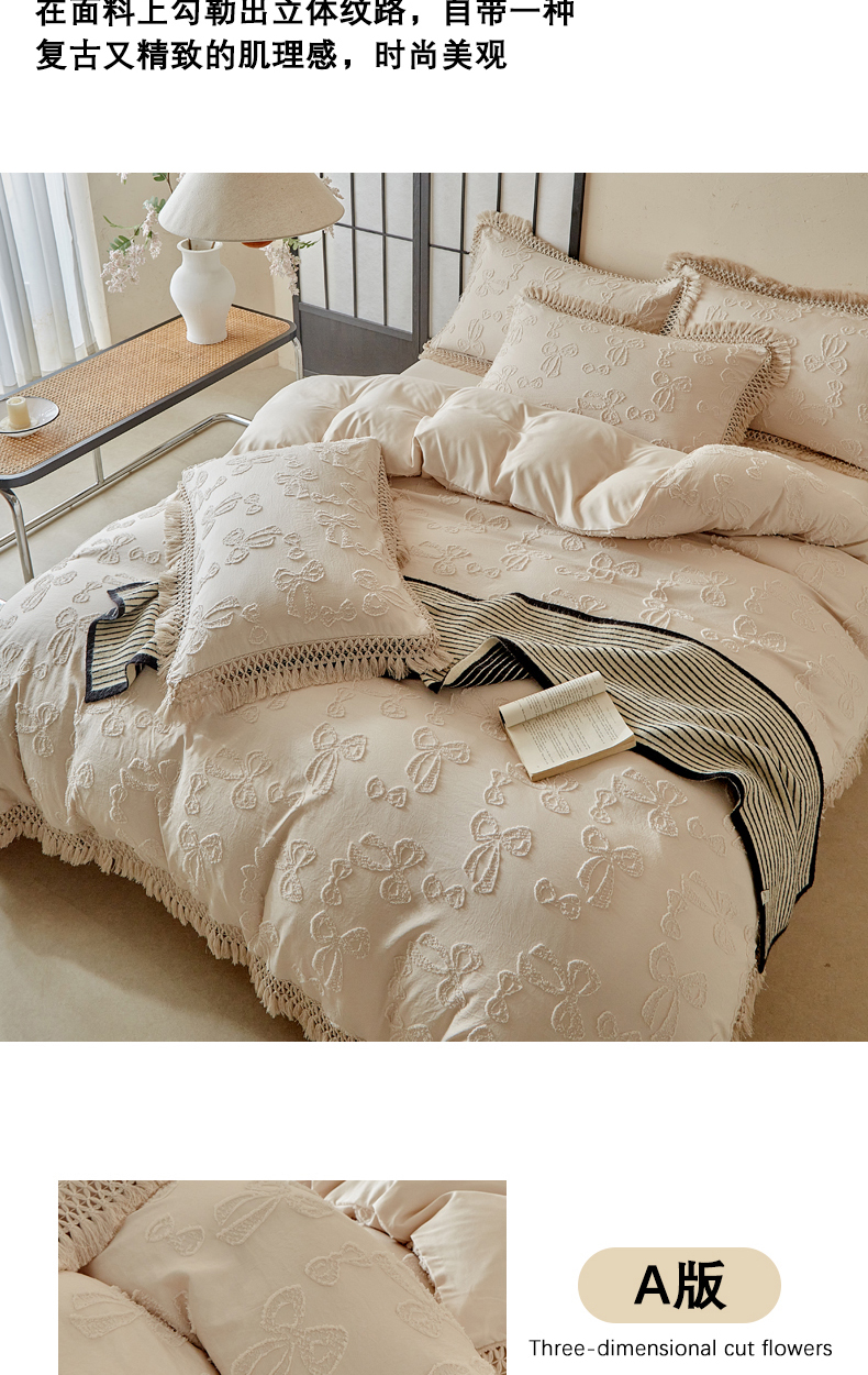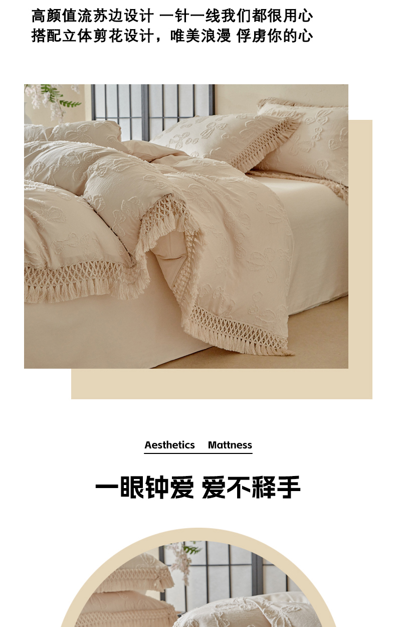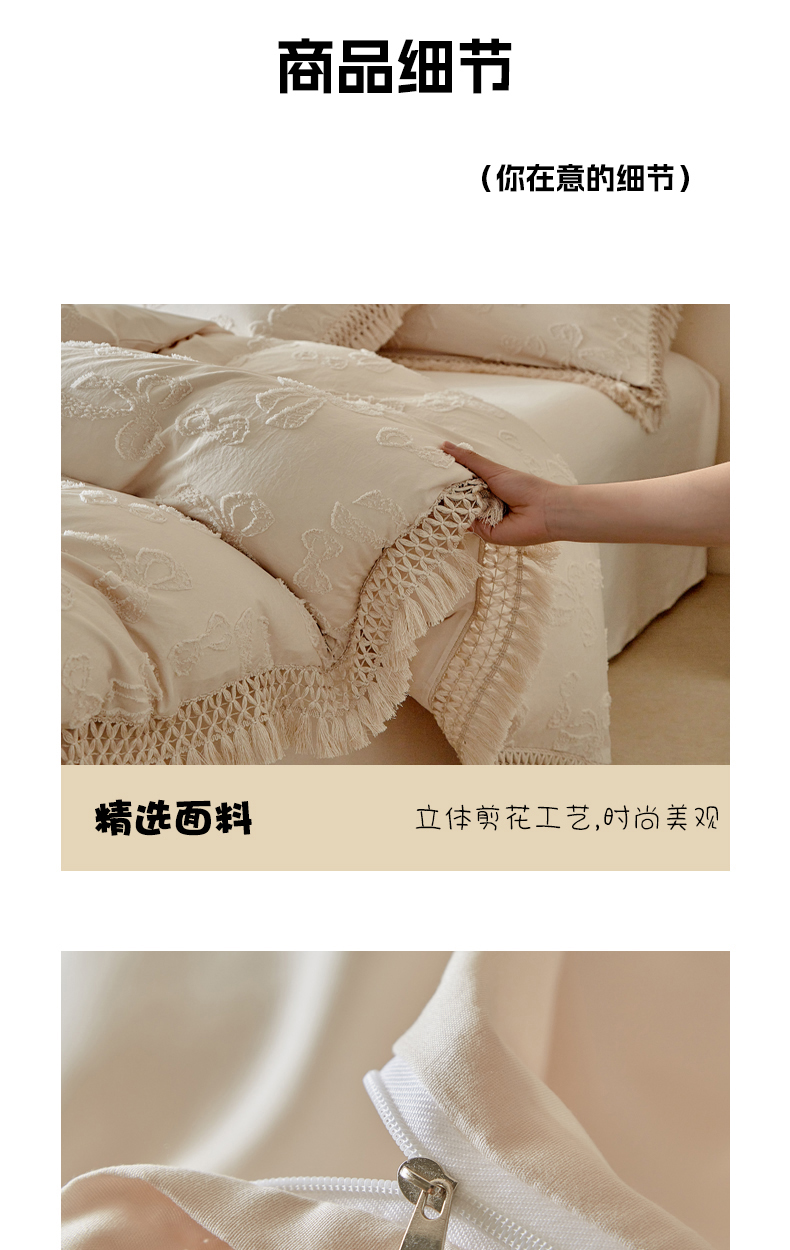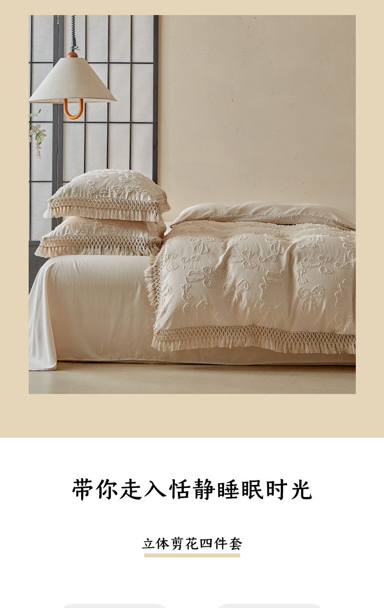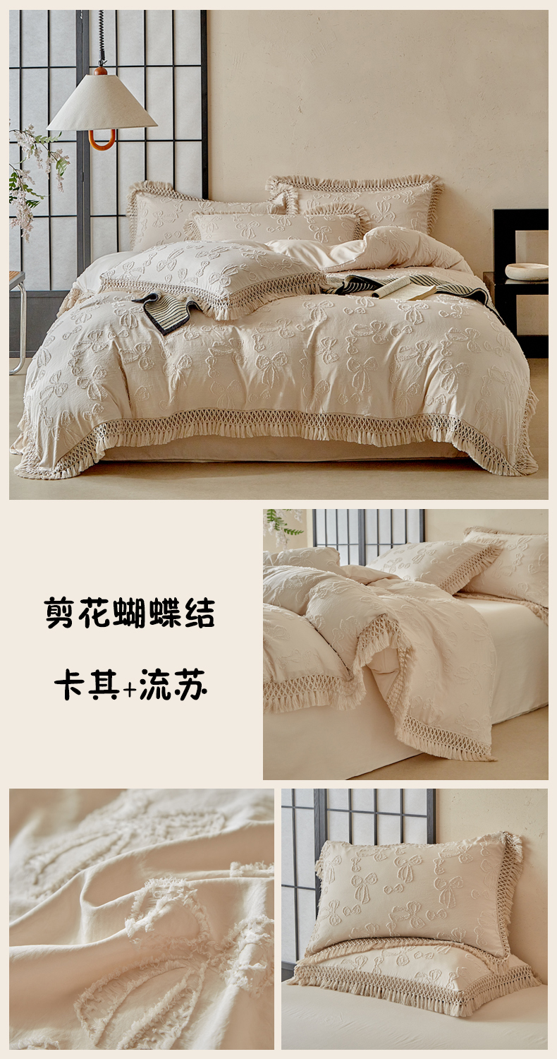 当前位置: 91家纺网 > 商品网购 > 床品套件 > 四件套 > 其它四件套 > 缘生活 2025新款立体剪花流苏四件套 四季通用-新增花型 剪花蝴蝶结 流苏+卡其
