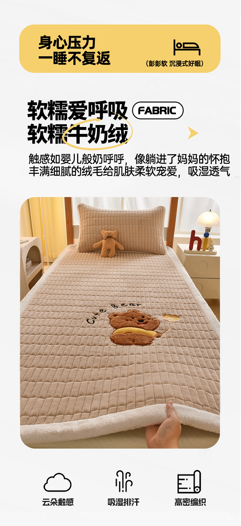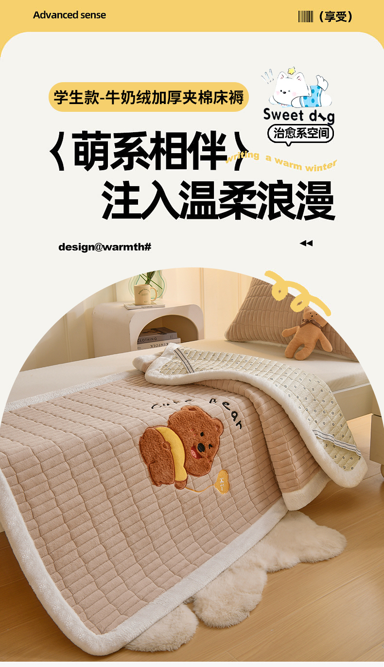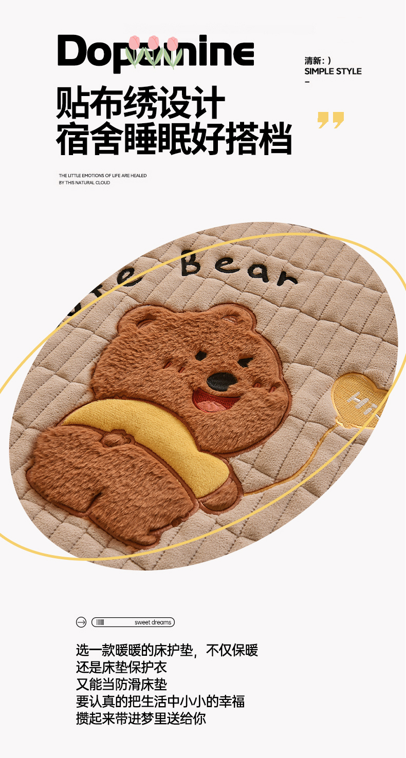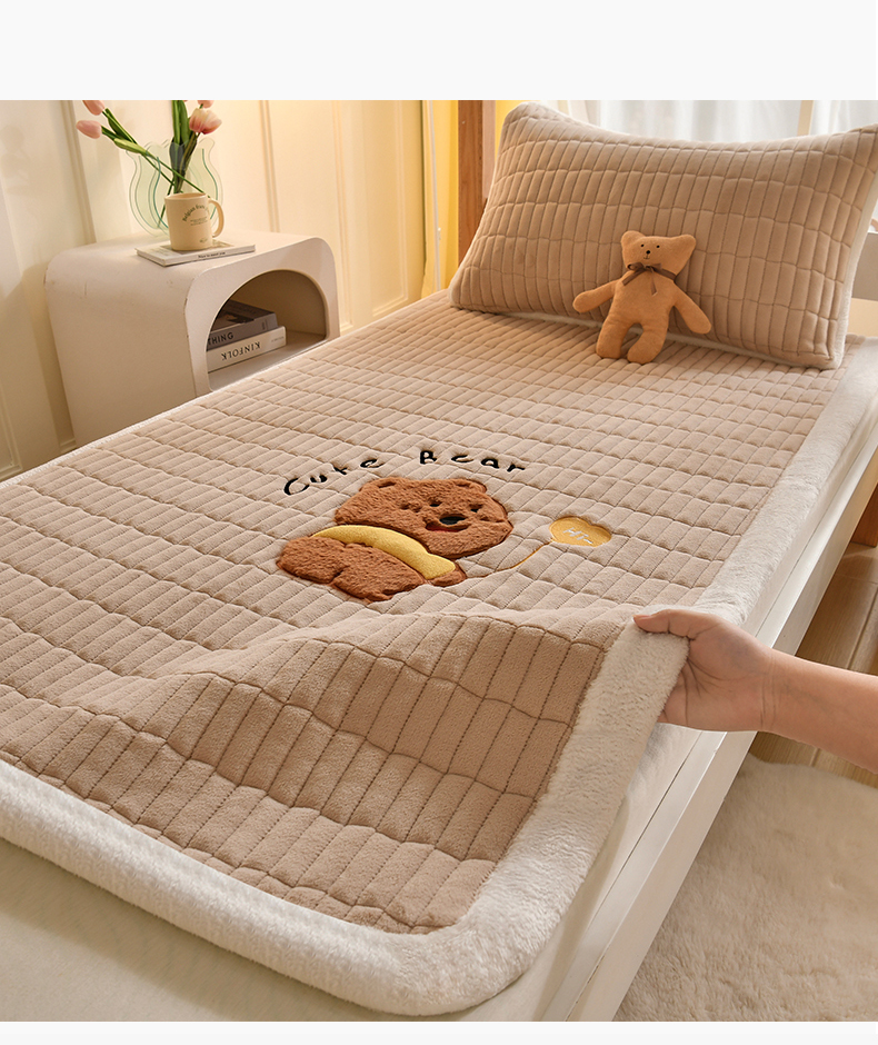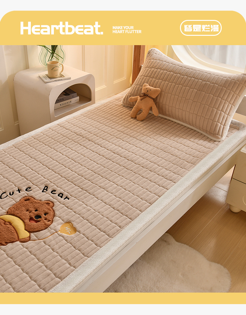 商品名称:悠米悠家 2025新款学生款兔毛绒刺绣夹棉上下铺床褥 小熊-卡其色