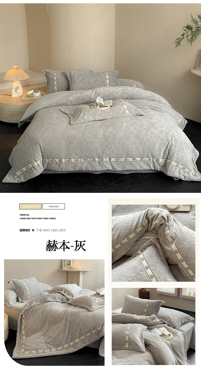 商品名称:凯儿家纺 2025新款全消光牛奶绒法式公主风花边工艺款四件套-赫本 赫本-灰