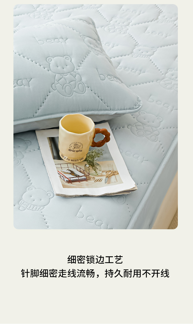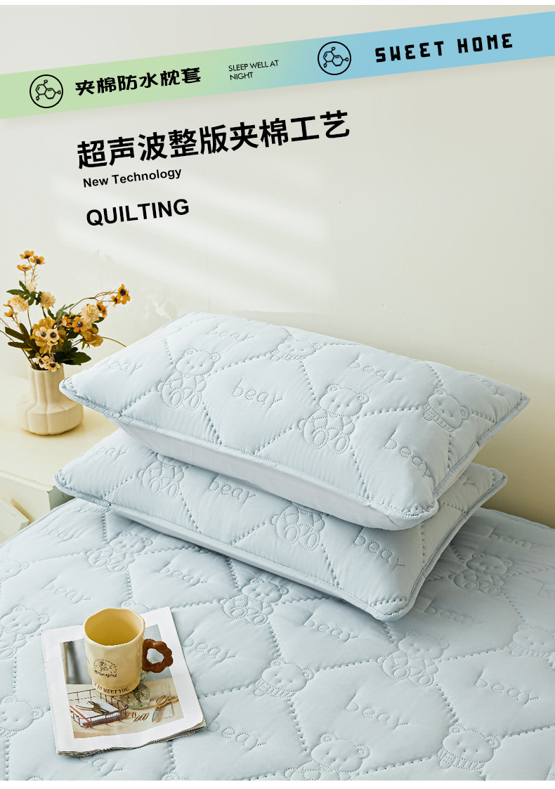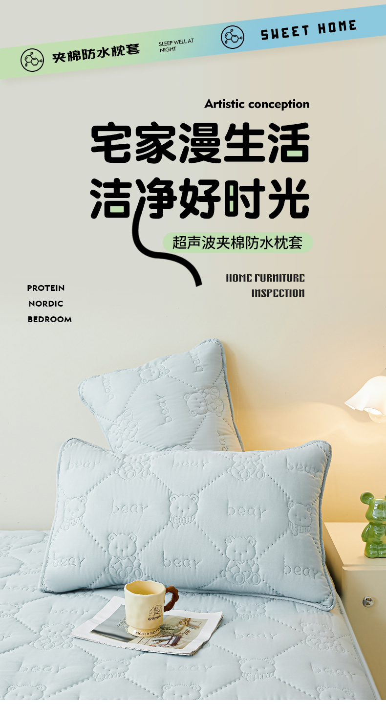 • 91家纺网 家纺一手货源 找家纺 LIFE.丽芙 2025新款磨毛超声波夹棉防水枕套机包边款 小熊防水夹棉枕套-天空蓝