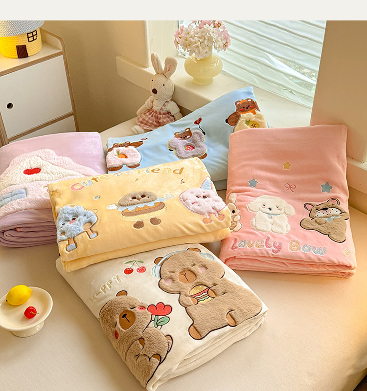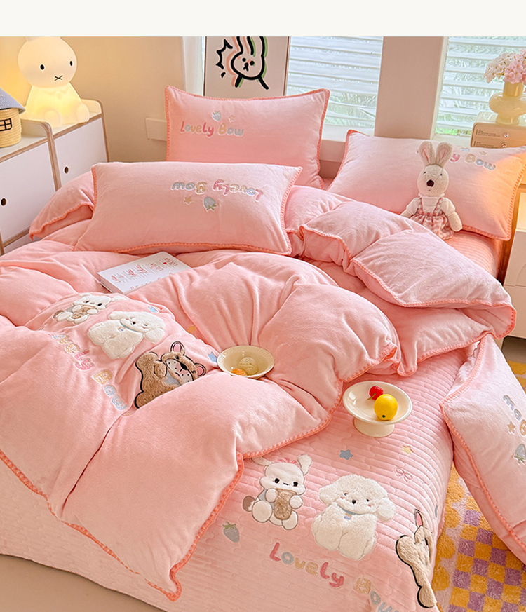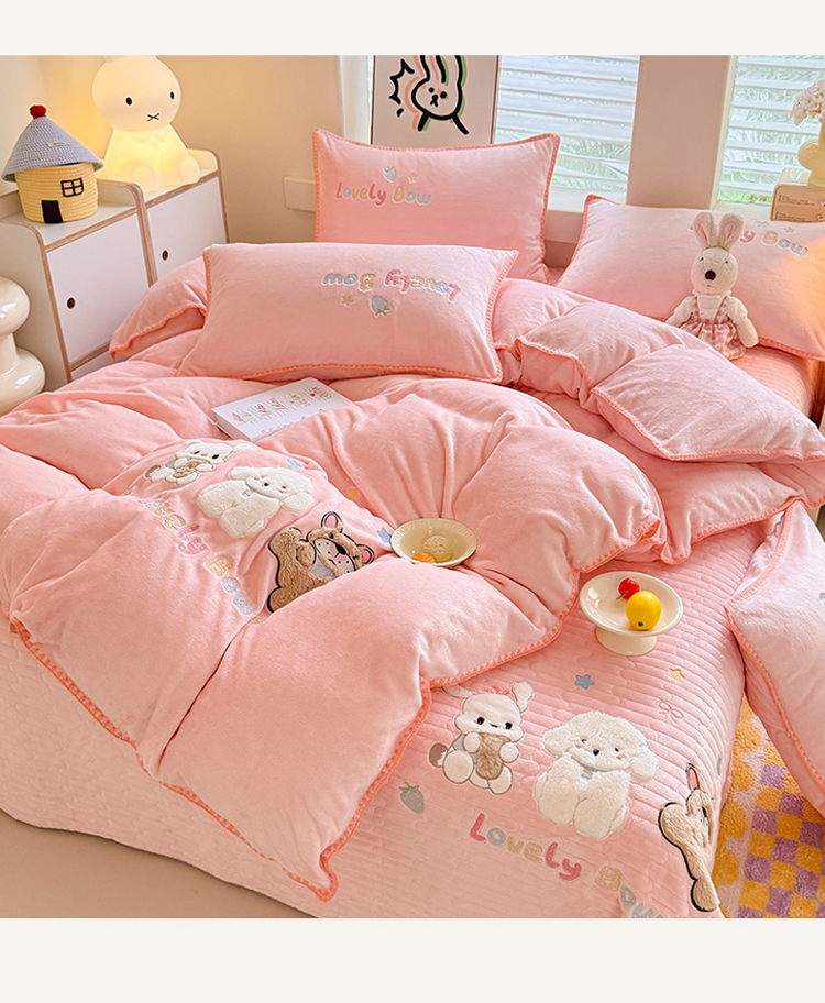 苏米娜家纺2025新款230g全消光大版卡通牛奶绒兔毛贴布绣花四件套可爱卡通男孩女孩法莱绒被套三件套 欢乐兔