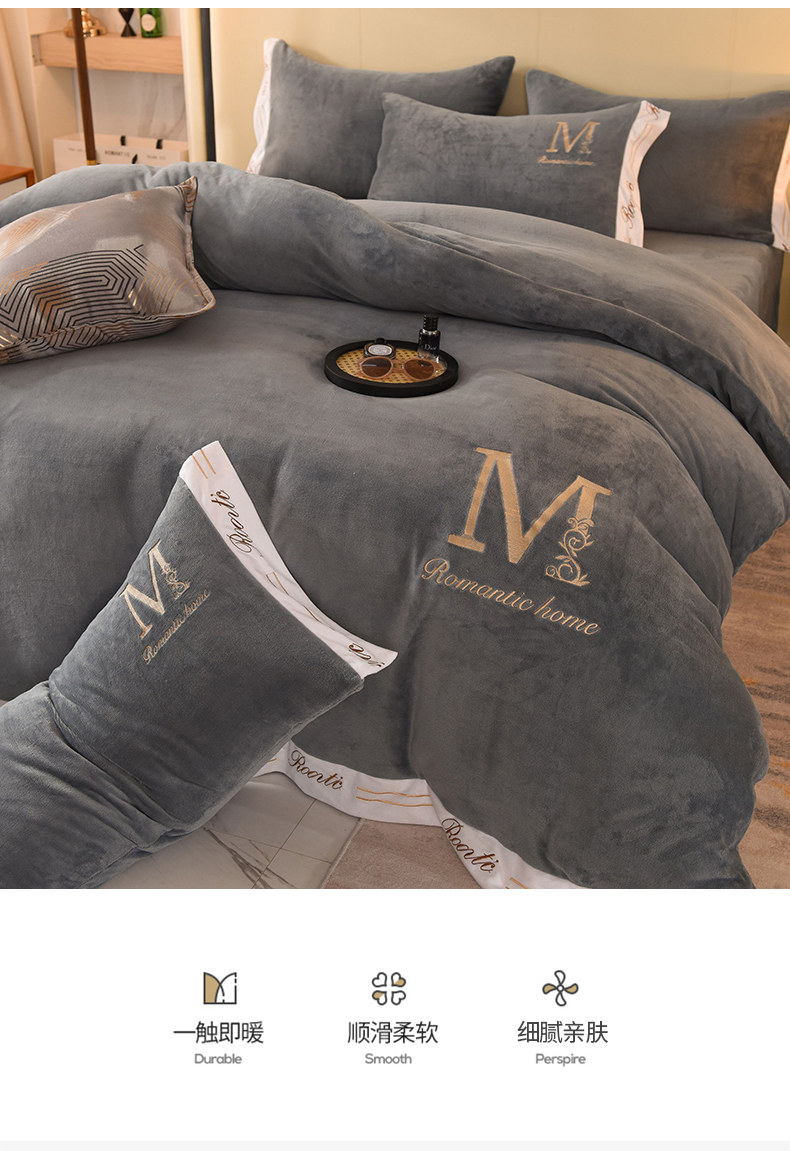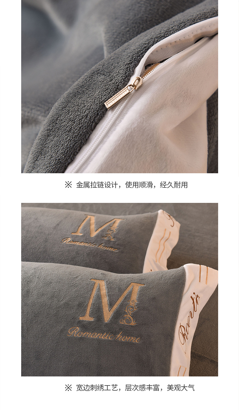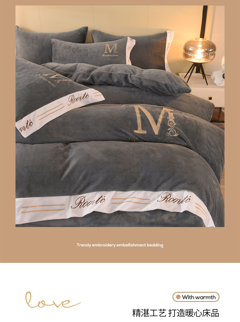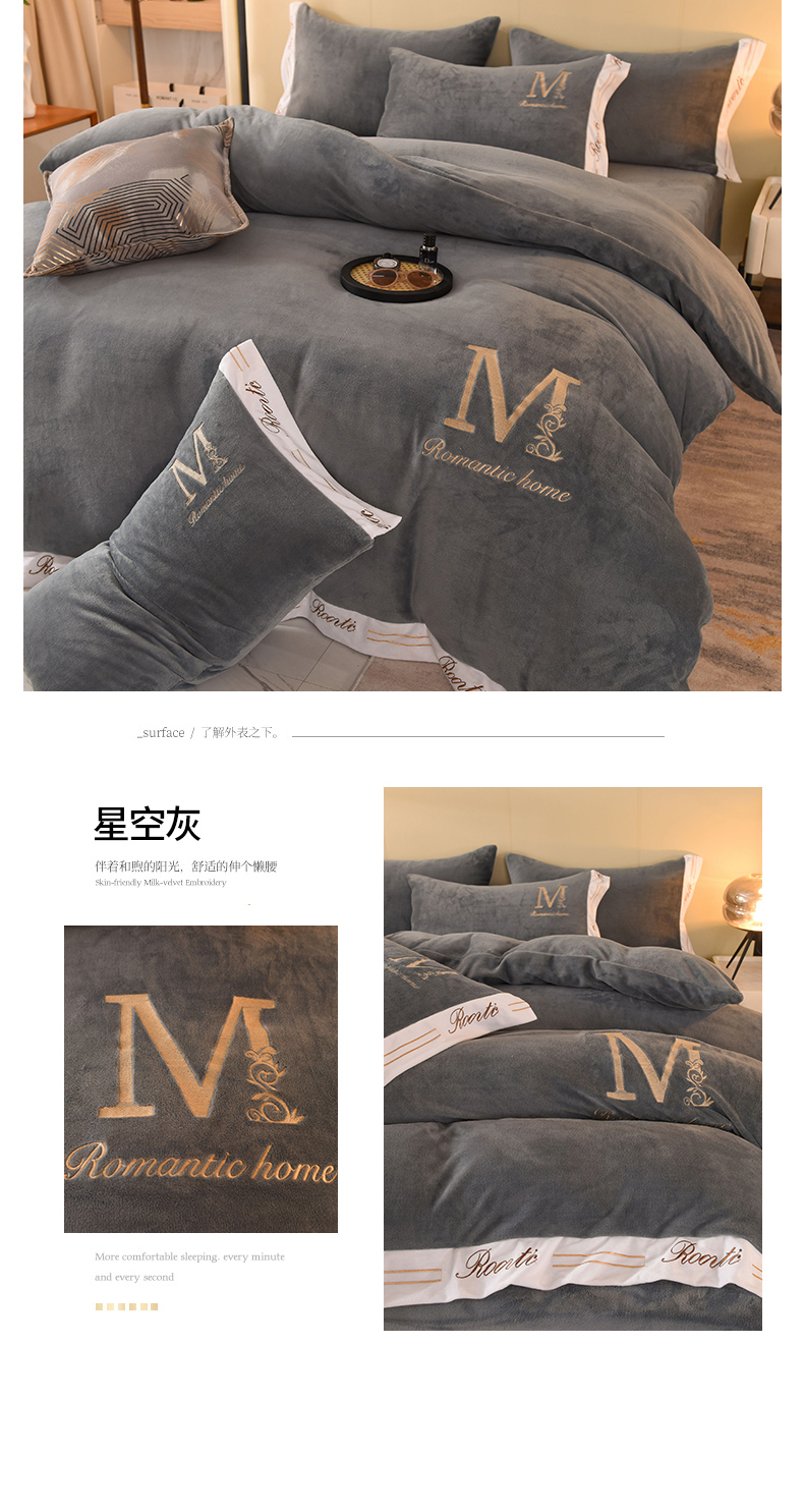 商品名称:大米家居 2025新款宽边刺绣牛奶绒四件套-罗曼蒂克系列 罗曼蒂克-星空灰