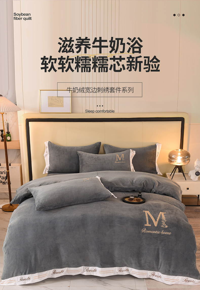 大米家居 2025新款宽边刺绣牛奶绒四件套-罗曼蒂克系列 罗曼蒂克-星空灰