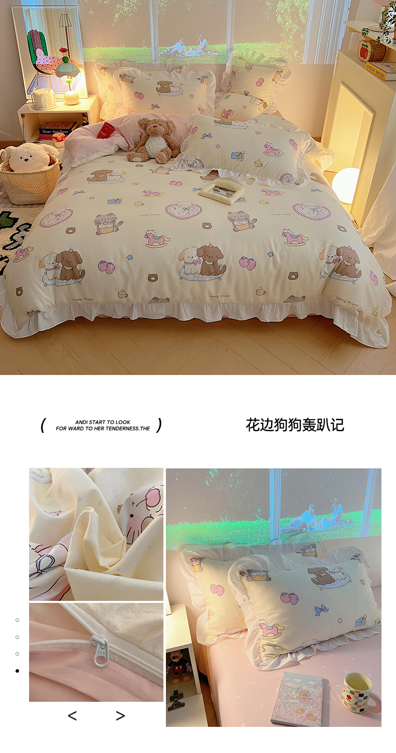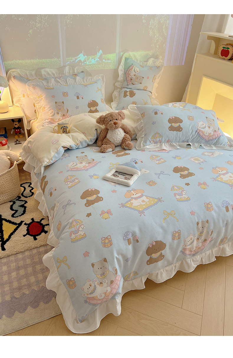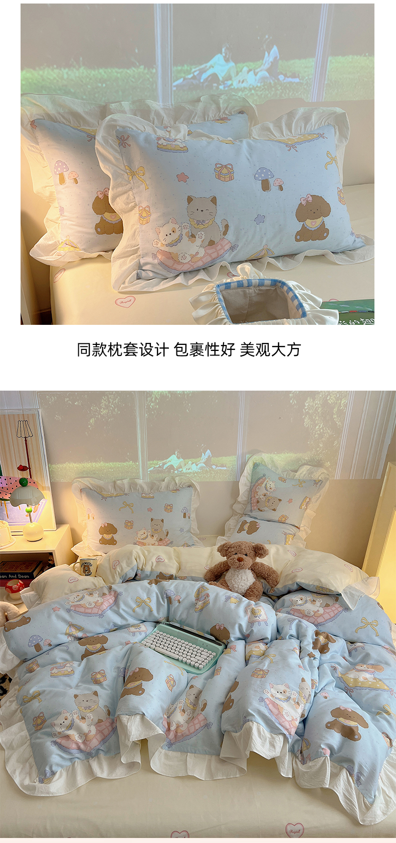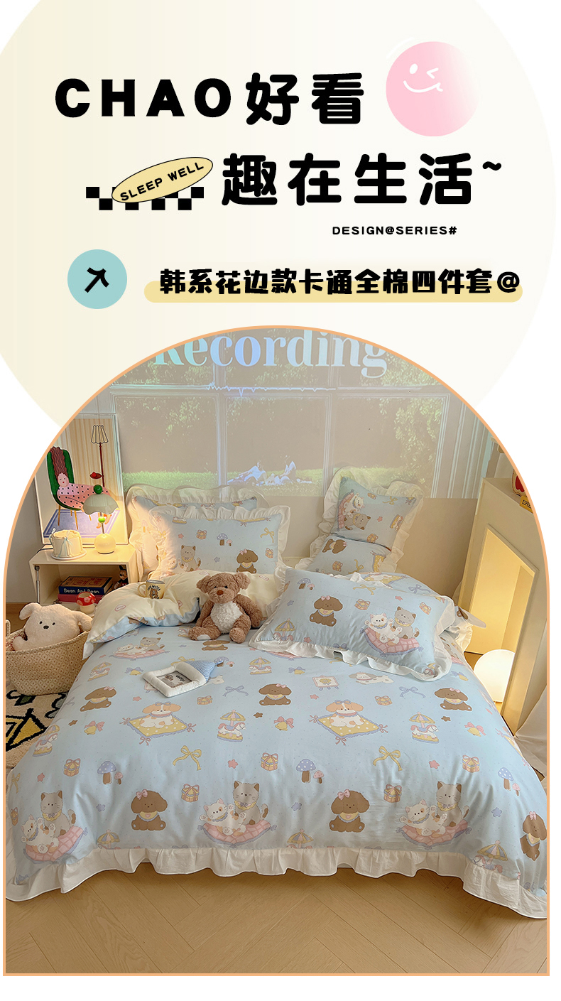 商品名称:六巷胡同 2026春夏新款韩系花边款卡通全棉四件套(第二系列)风格一 花边猫狗游园会
