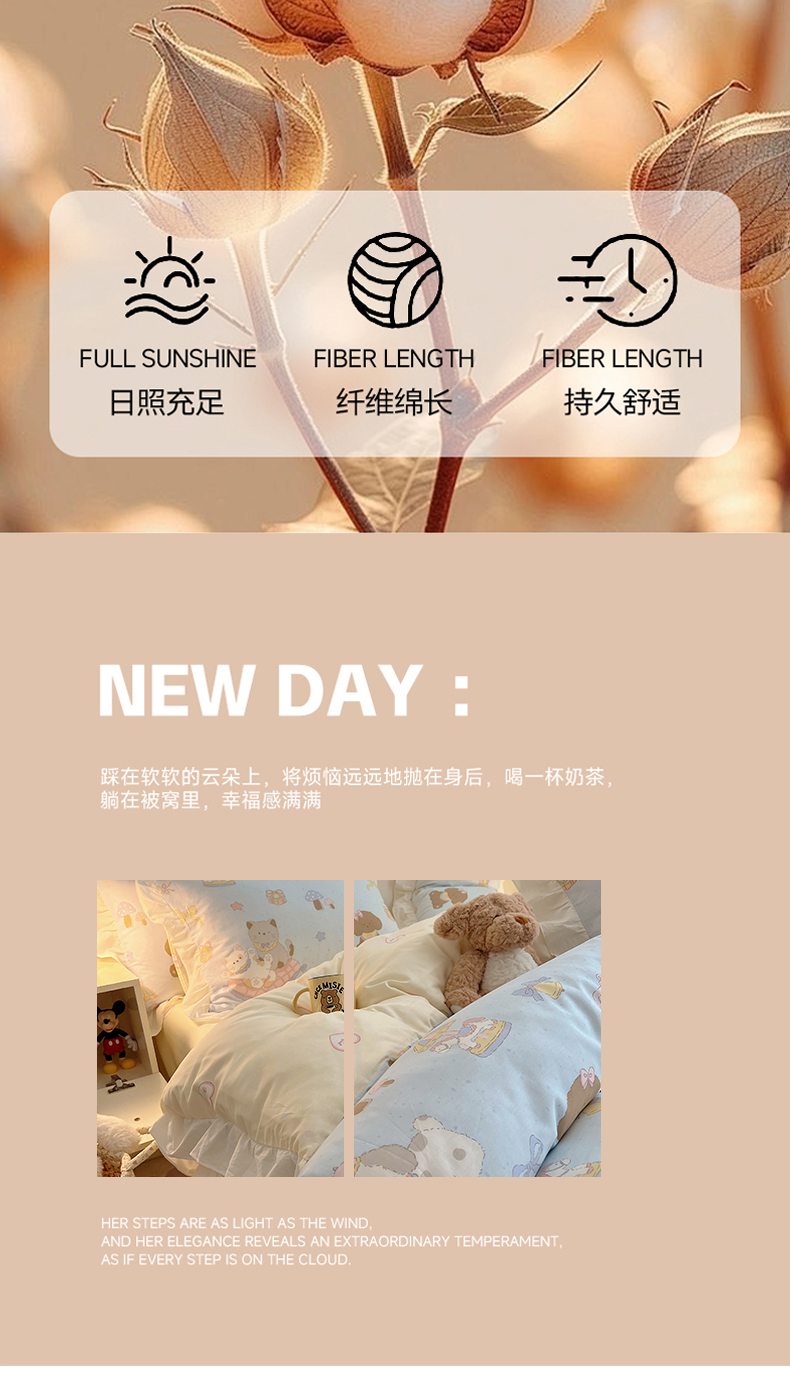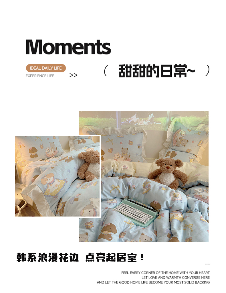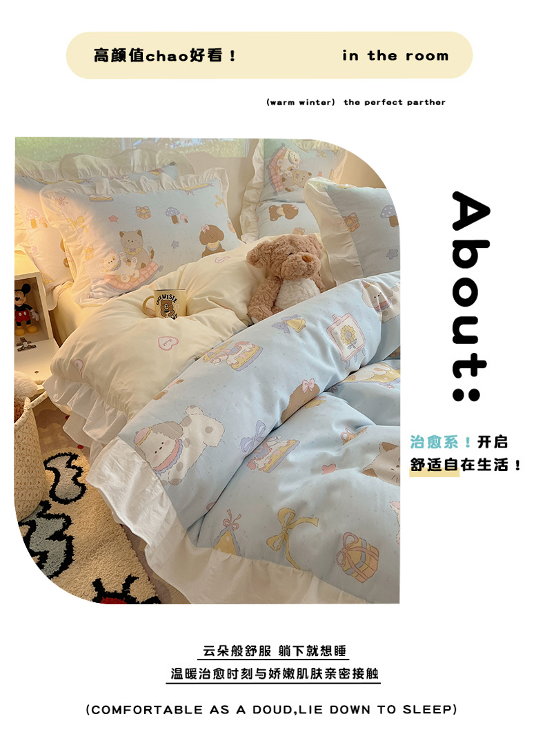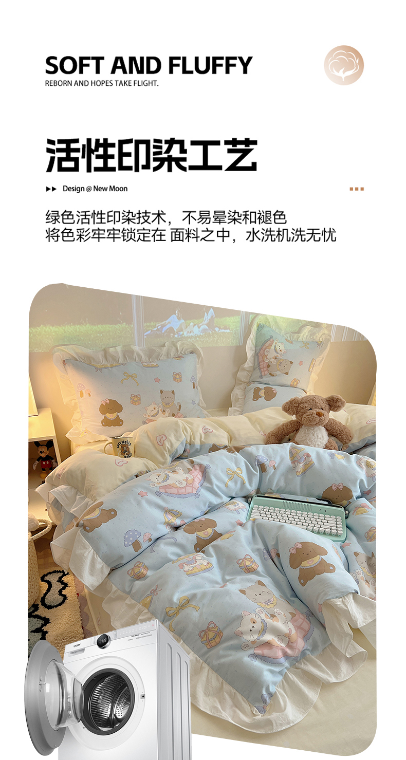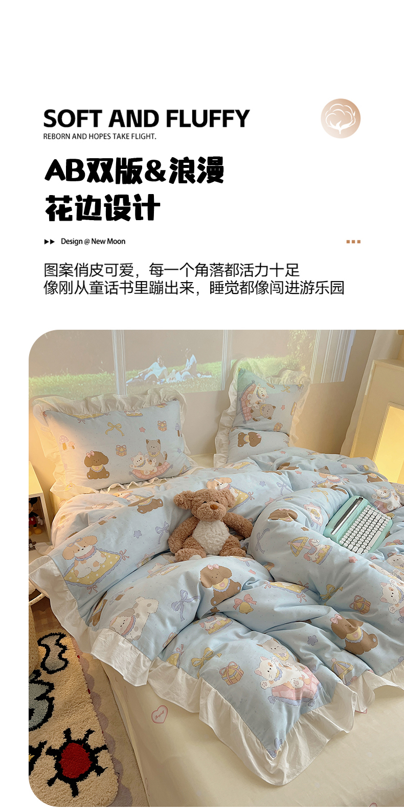 商品名称:六巷胡同 2026春夏新款韩系花边款卡通全棉四件套(第二系列)风格一 花边猫狗游园会