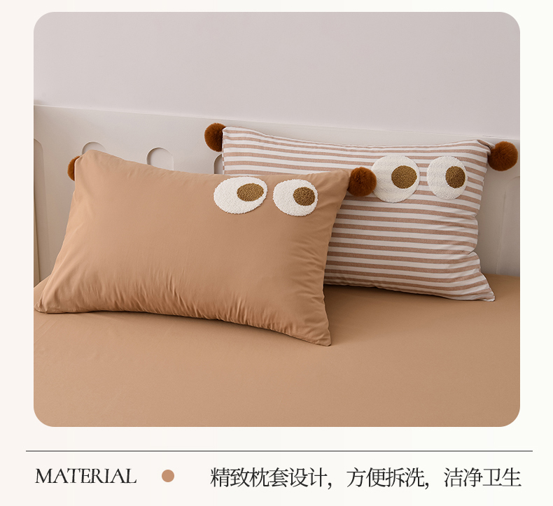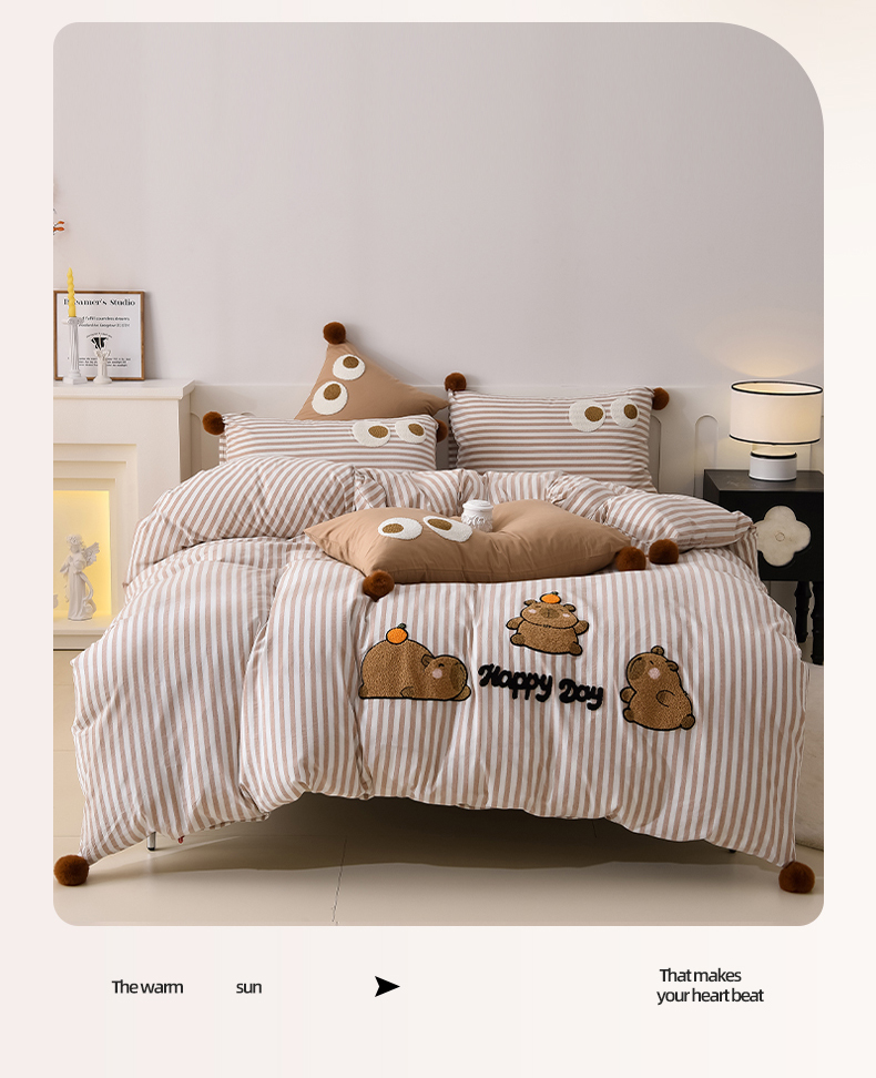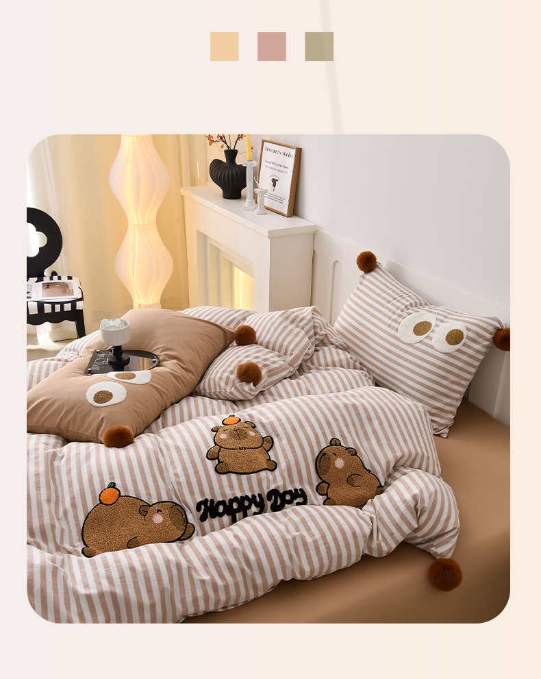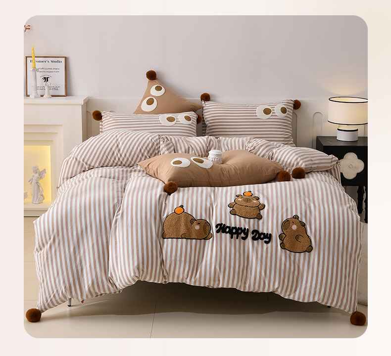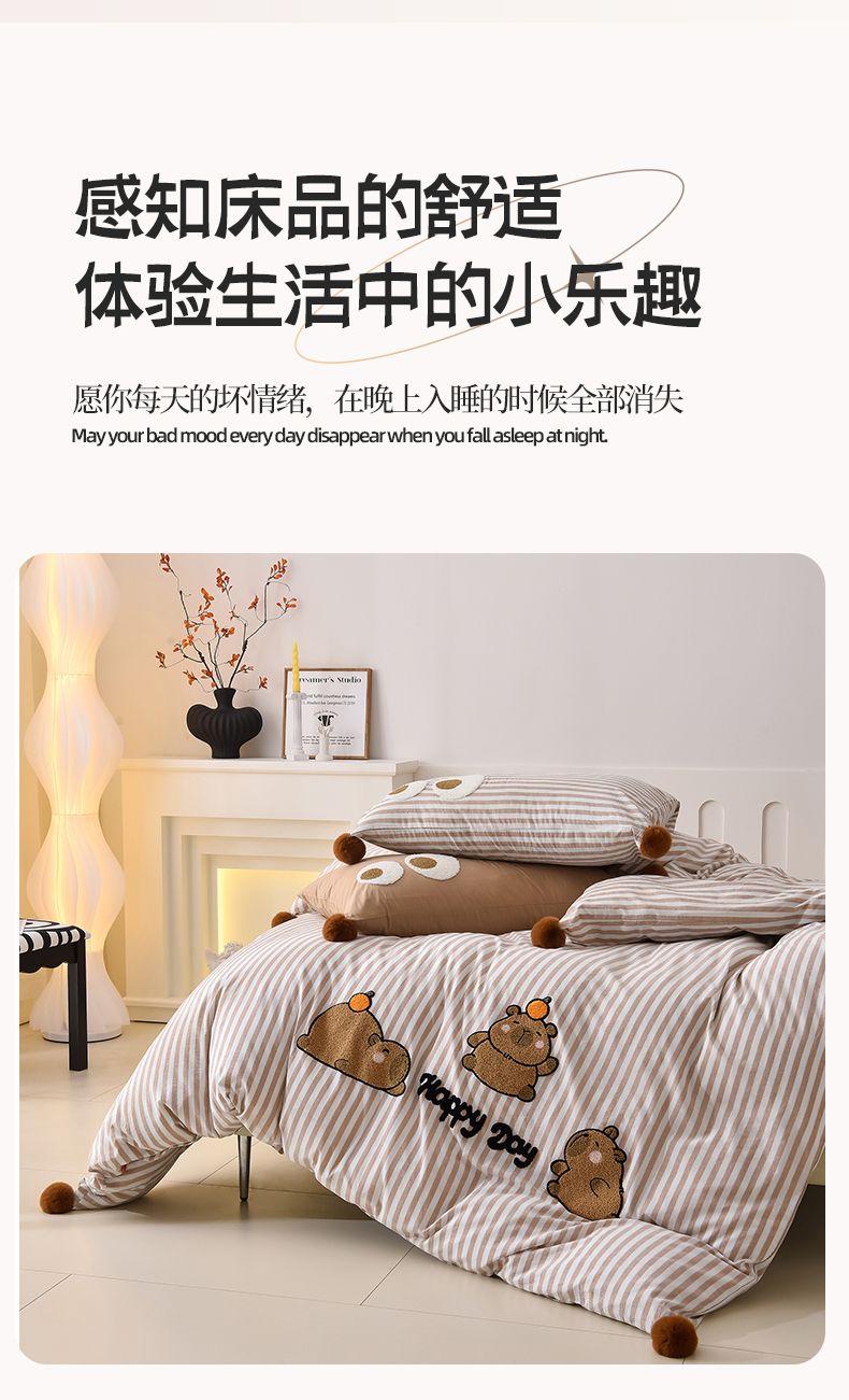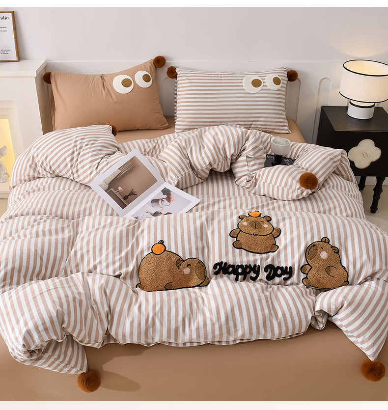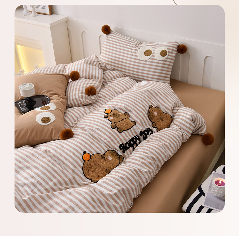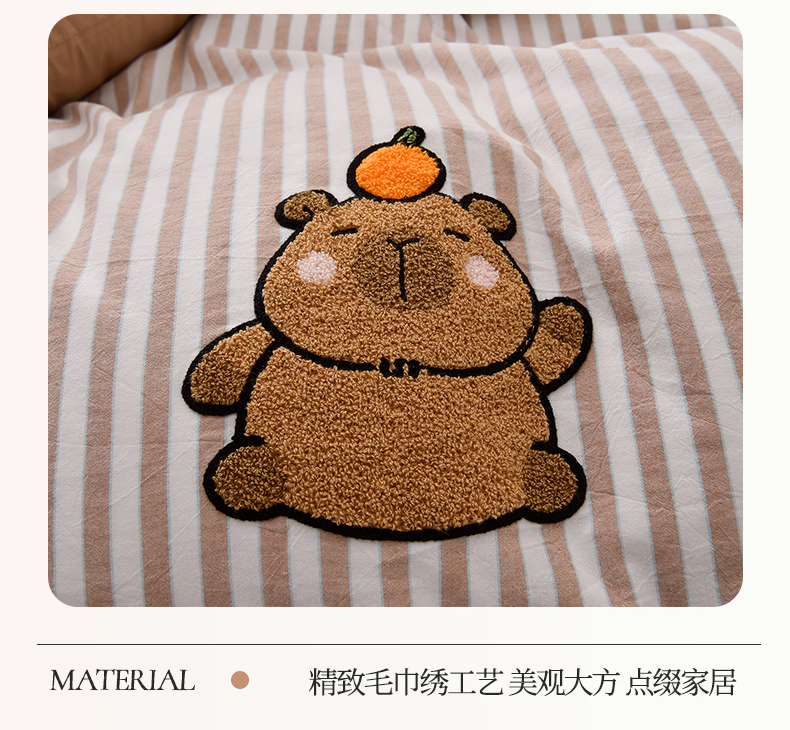 商品名称:炫拼家纺 2026新款卡通毛巾绣A类全棉40支水洗棉贴布绣平绣纯棉四件套-毛球系列 毛球-卡皮巴拉咖