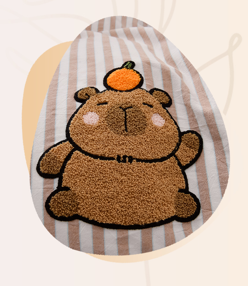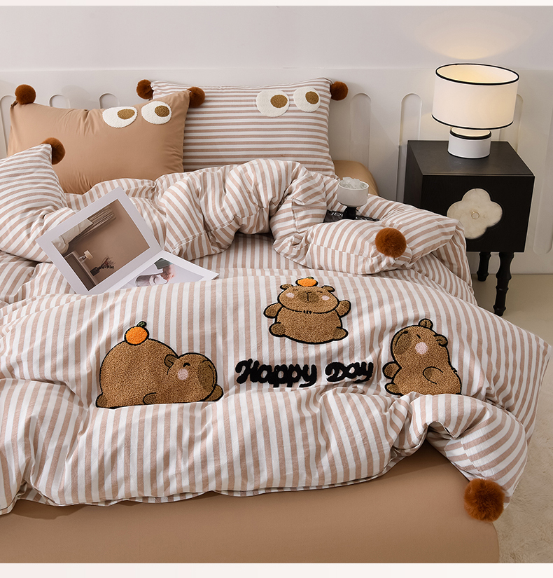 炫拼家纺 2026新款卡通毛巾绣A类全棉40支水洗棉贴布绣平绣纯棉四件套-毛球系列 毛球-卡皮巴拉咖
