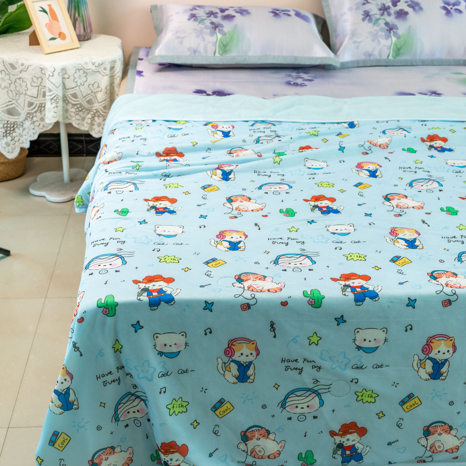 商品名称:欣宜家纺 2025新款母婴级卡通冰淇淋夏被夏凉空调冰丝薄款被芯可机洗凉感丝冰皮被子 被子被芯 摇滚猫