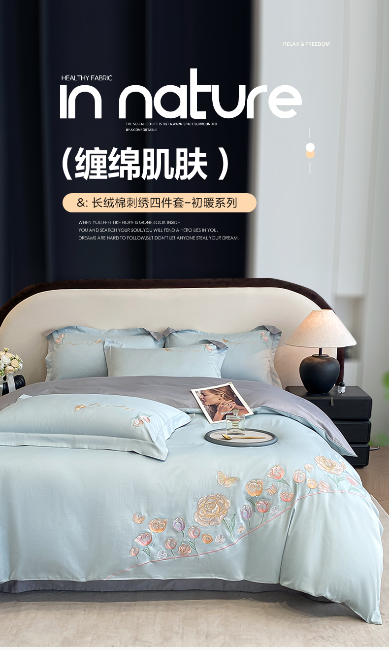 欣宜家纺 2025新款纯棉全棉长绒棉刺绣绣花高端礼盒初暖系列四件套 飘蓝色