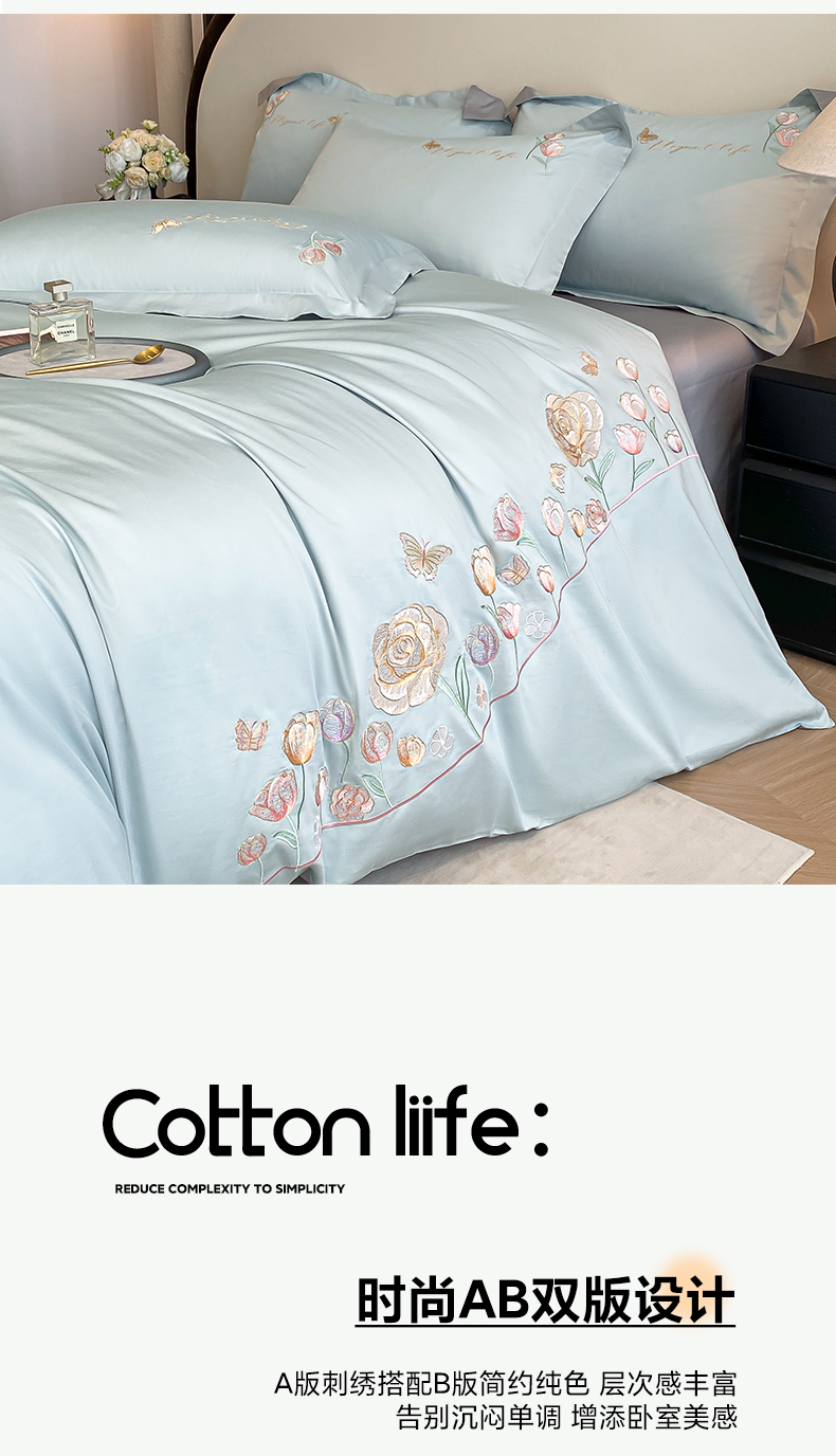 (总)欣宜家纺 2026春夏新款60支A类新疆长绒棉刺绣轻奢风四件套,樱花-白粉,樱花-清香绿,樱花-少女粉,樱花-天天蓝,樱花-香芋紫