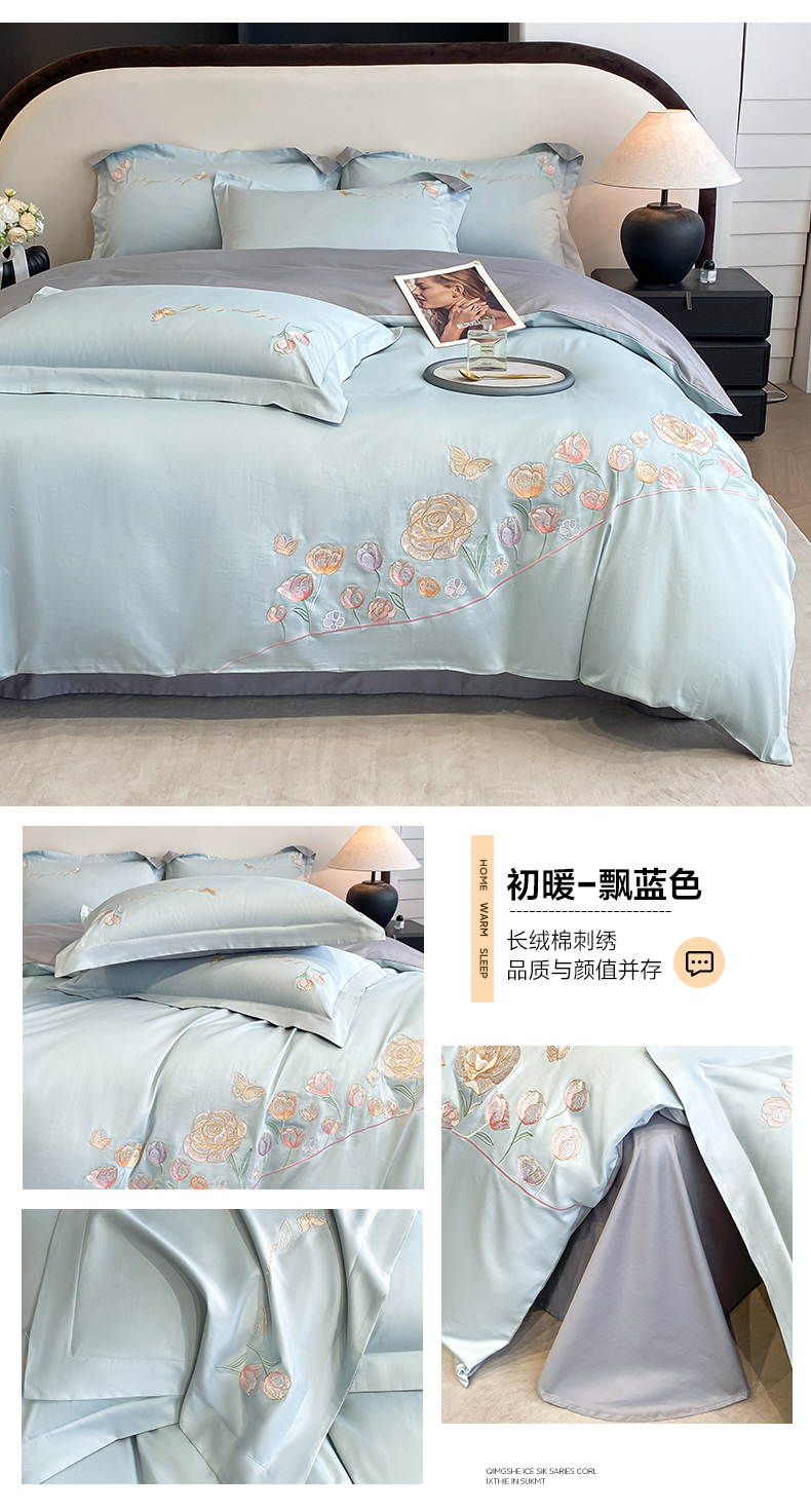 商品名称:欣宜家纺 2025新款纯棉全棉长绒棉刺绣绣花高端礼盒初暖系列四件套 飘蓝色