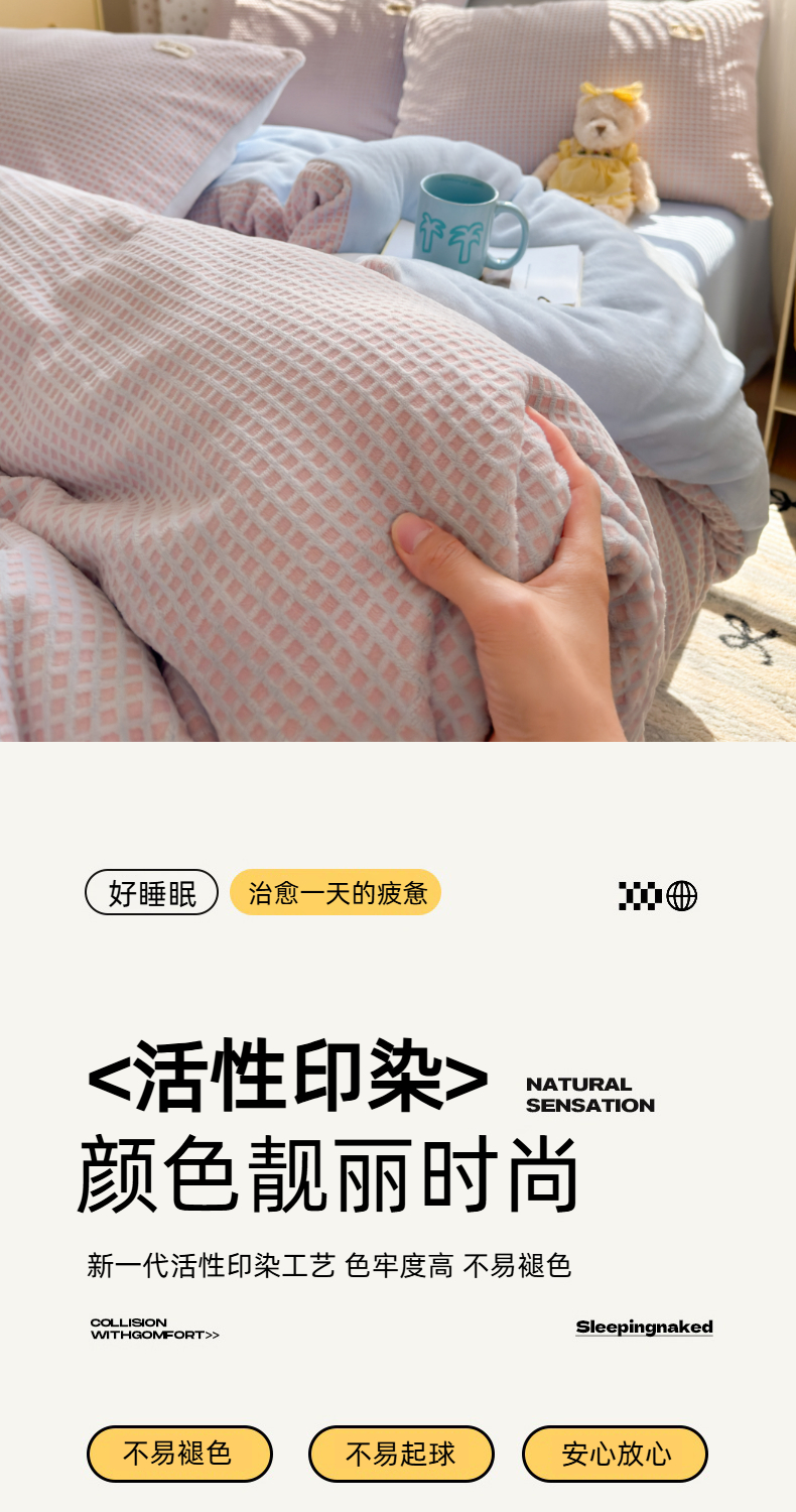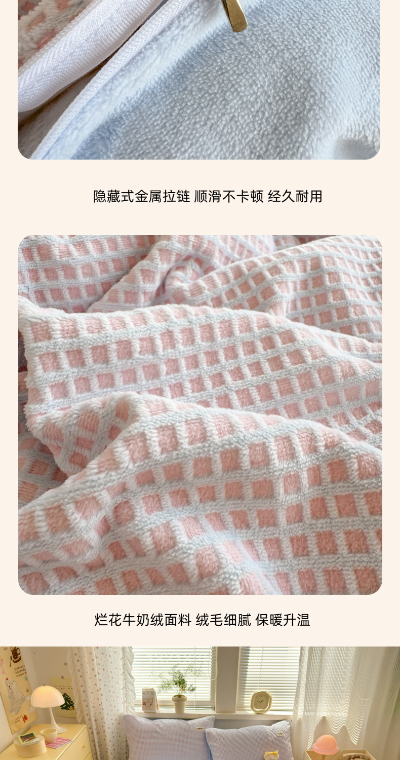 商品名称:欣宜家纺 2025秋冬新款ins奶油风双拼华夫格烂花雕花绒牛奶绒四件套 华夫格-蓝粉