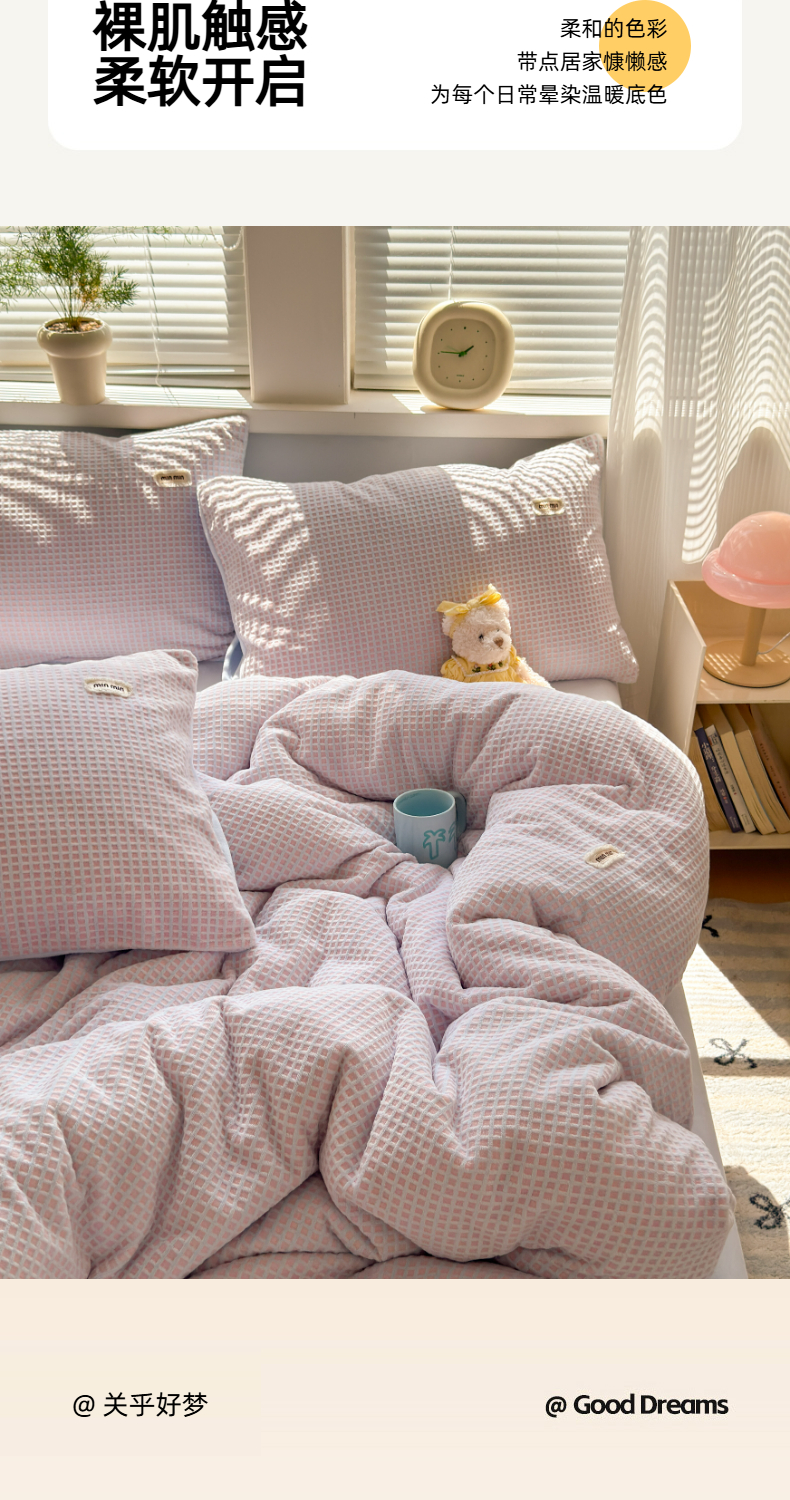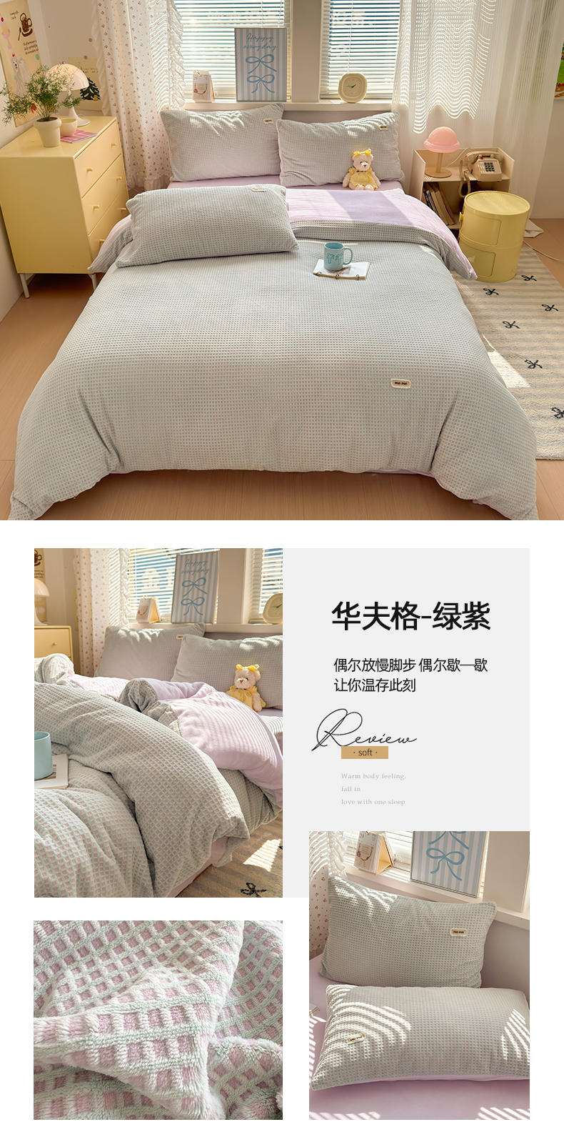 欣宜家纺 2025秋冬新款ins奶油风双拼华夫格烂花雕花绒牛奶绒四件套 华夫格-蓝粉