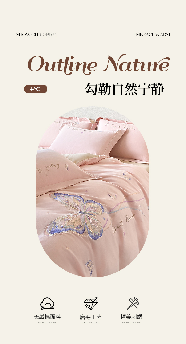 商品名称:欣宜家纺 2025新款秋冬纯棉全棉长绒棉磨毛刺绣床上四件套高端礼盒-蝶町系列(含买家秀) 蝶町-轻奢粉