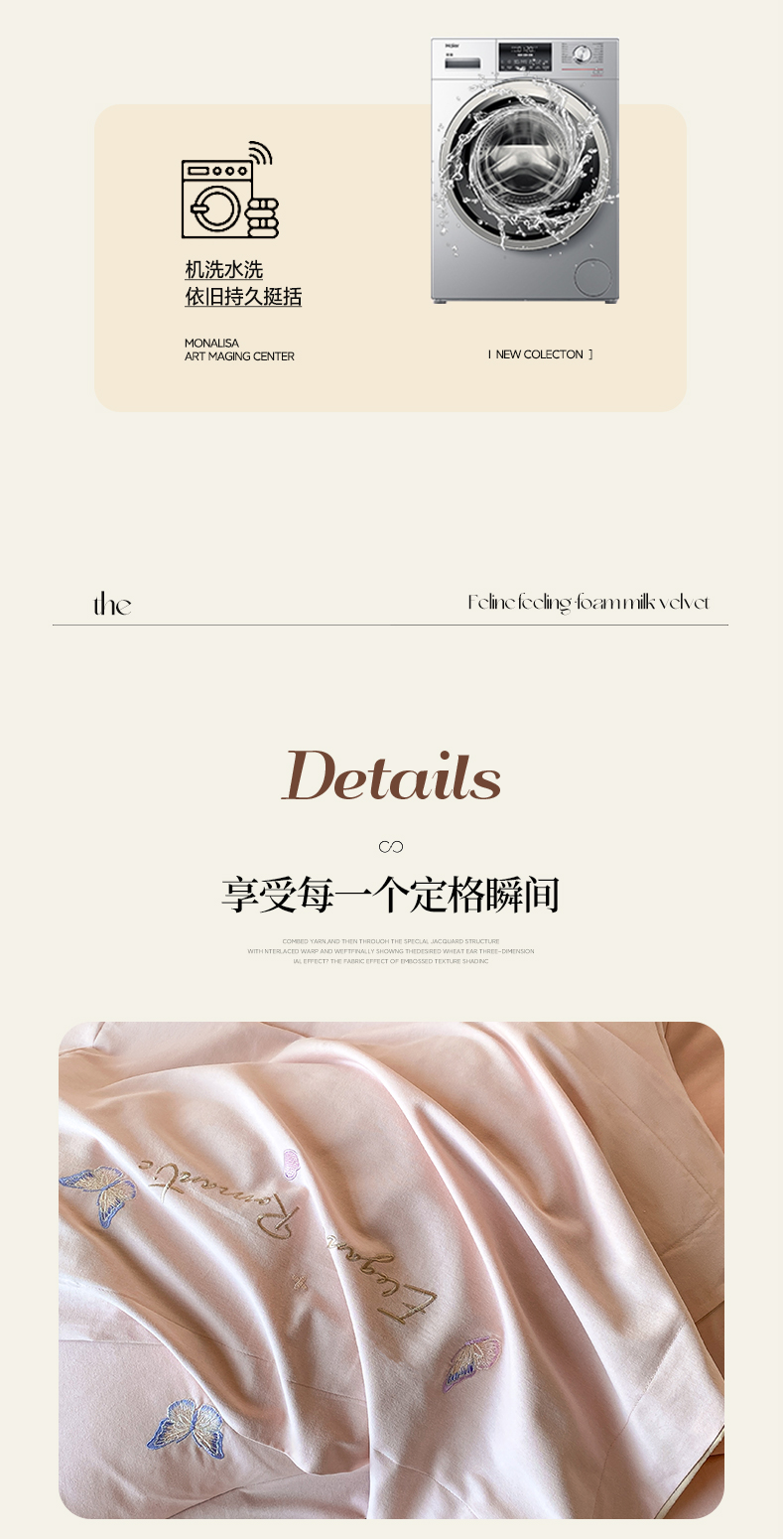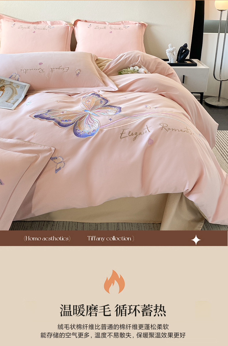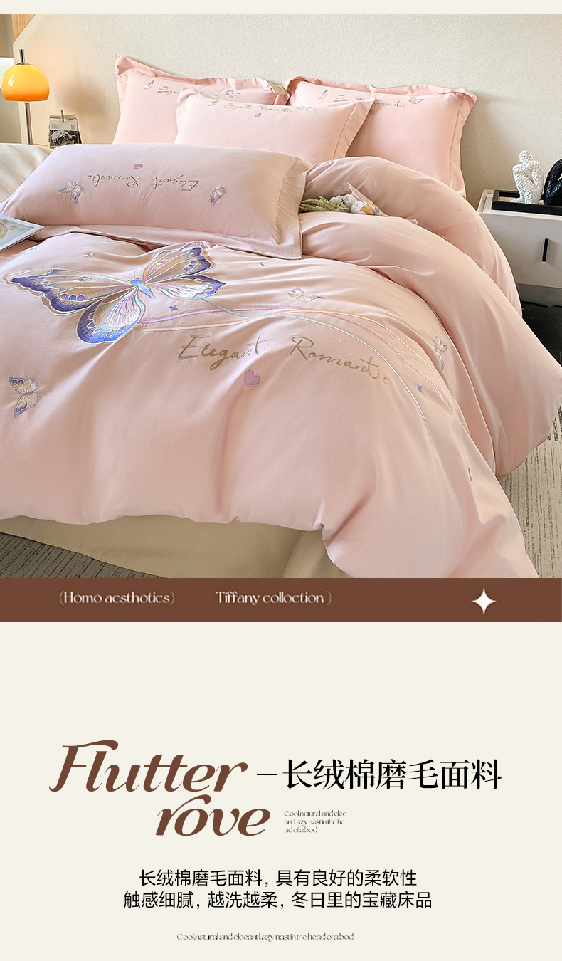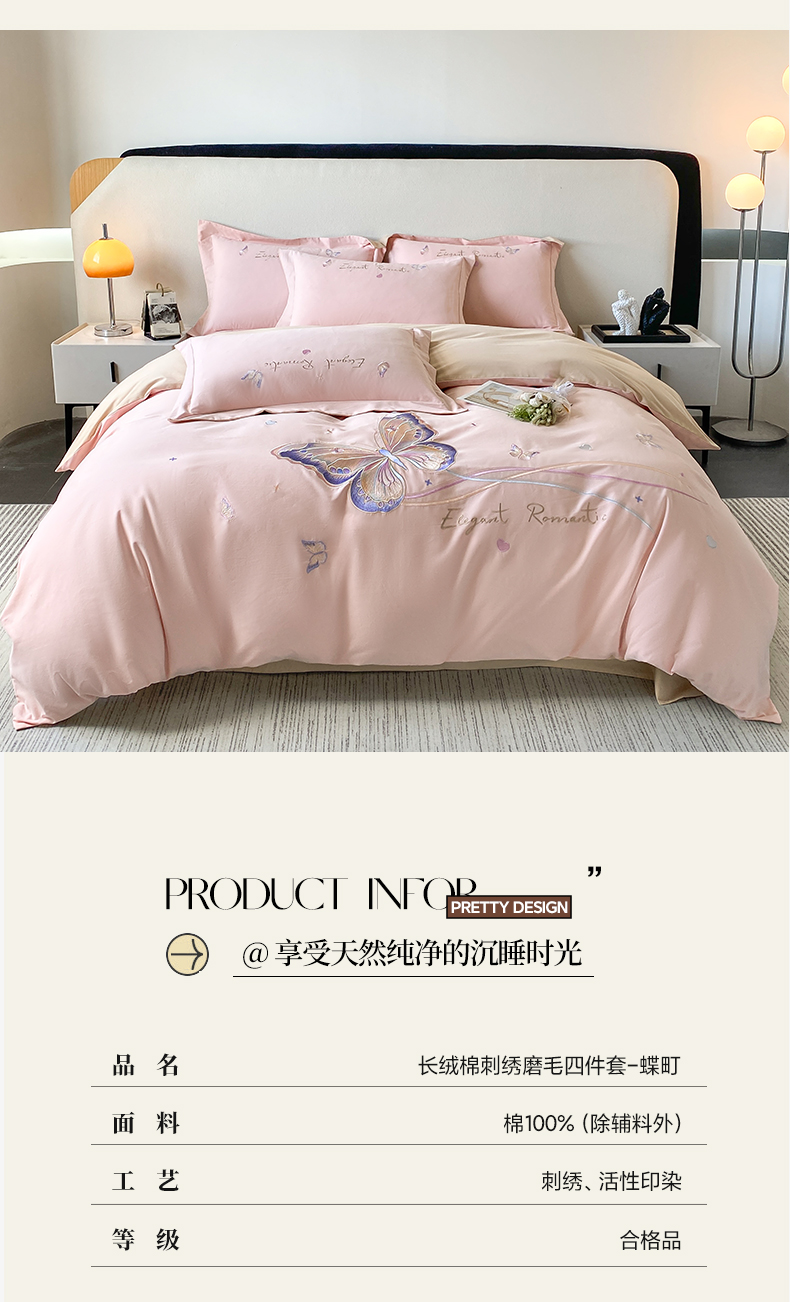 欣宜家纺 2025新款秋冬纯棉全棉长绒棉磨毛刺绣床上四件套高端礼盒-蝶町系列(含买家秀) 蝶町-轻奢粉