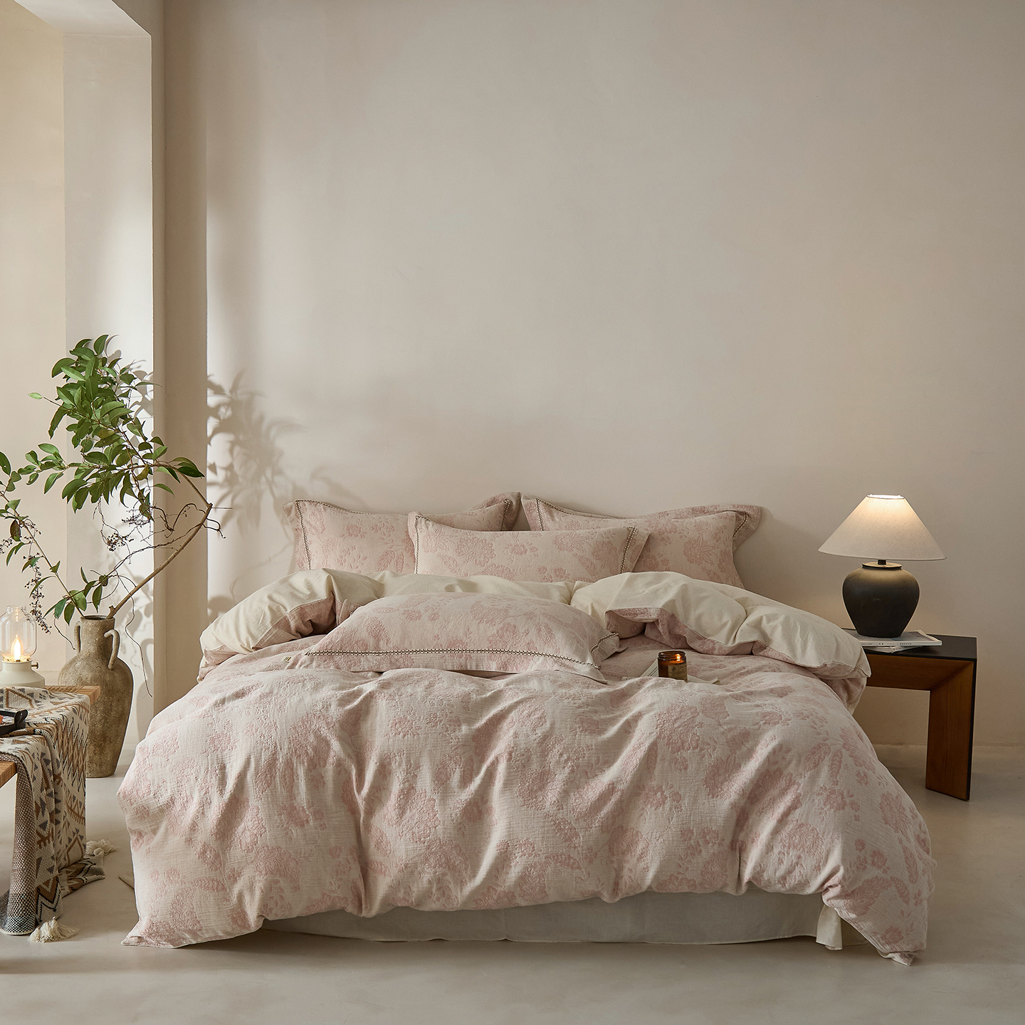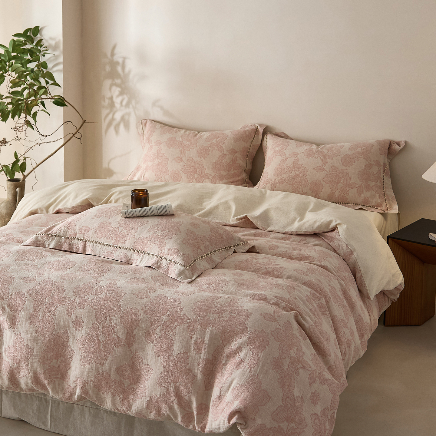 莱豫家纺 2026新款A类亚麻棉麻色织提花工艺款四件套 落庭霜粉