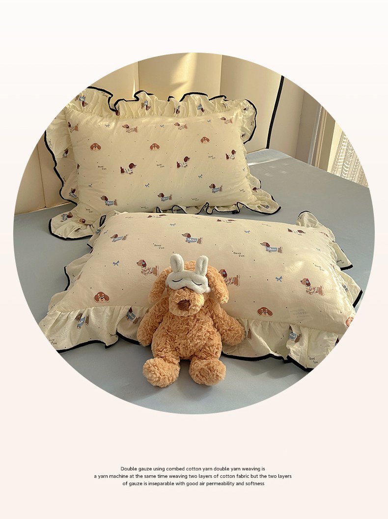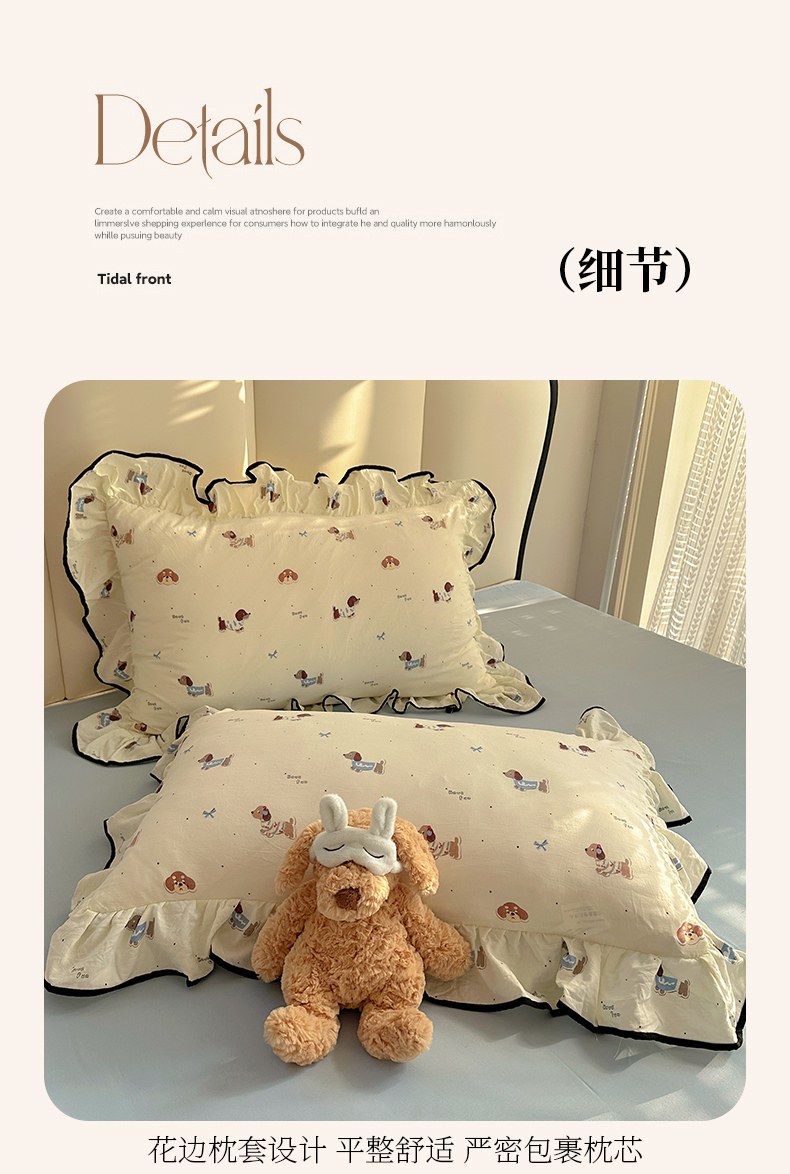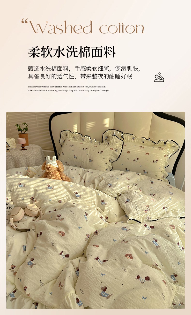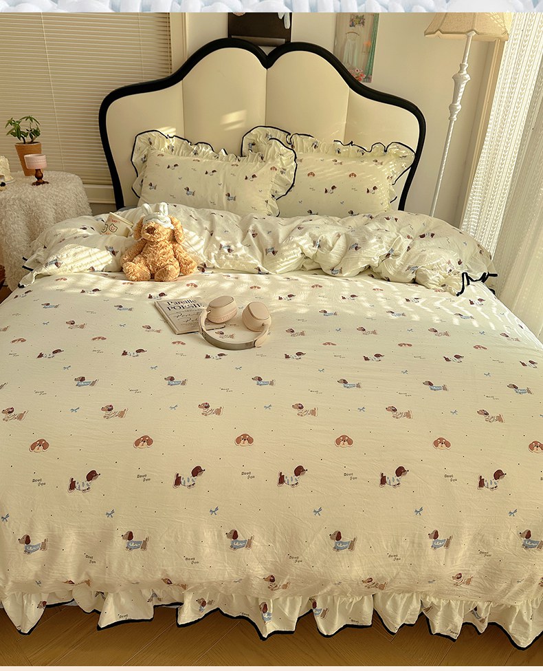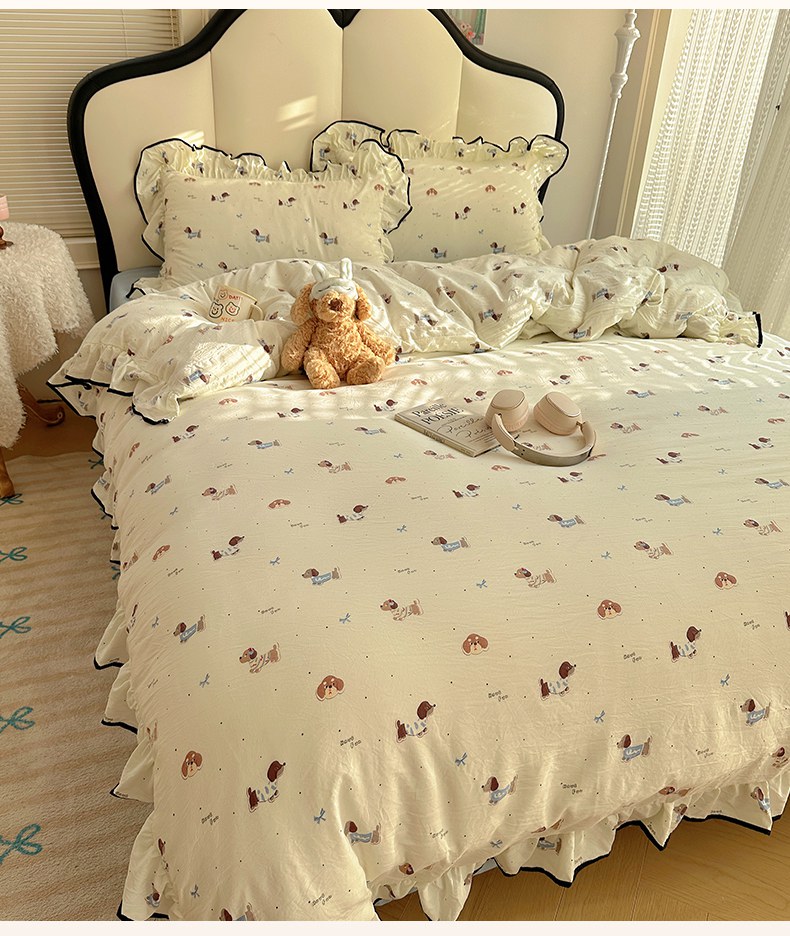 当前位置: 91家纺网 > 商品网购 > 床品套件 > 四件套 > 水洗棉四件套 > 韩巢家纺 2026新款水洗棉花边款四件套 可可腊肠犬【大花边款】