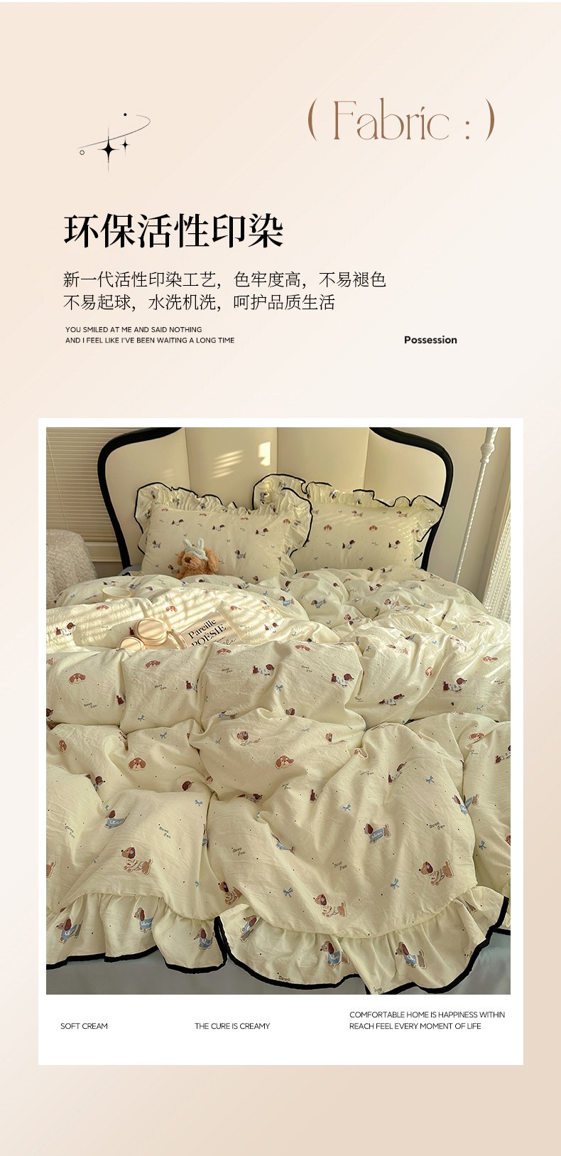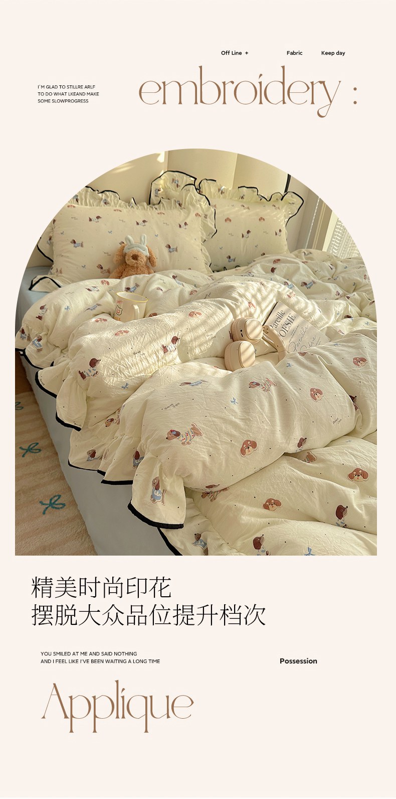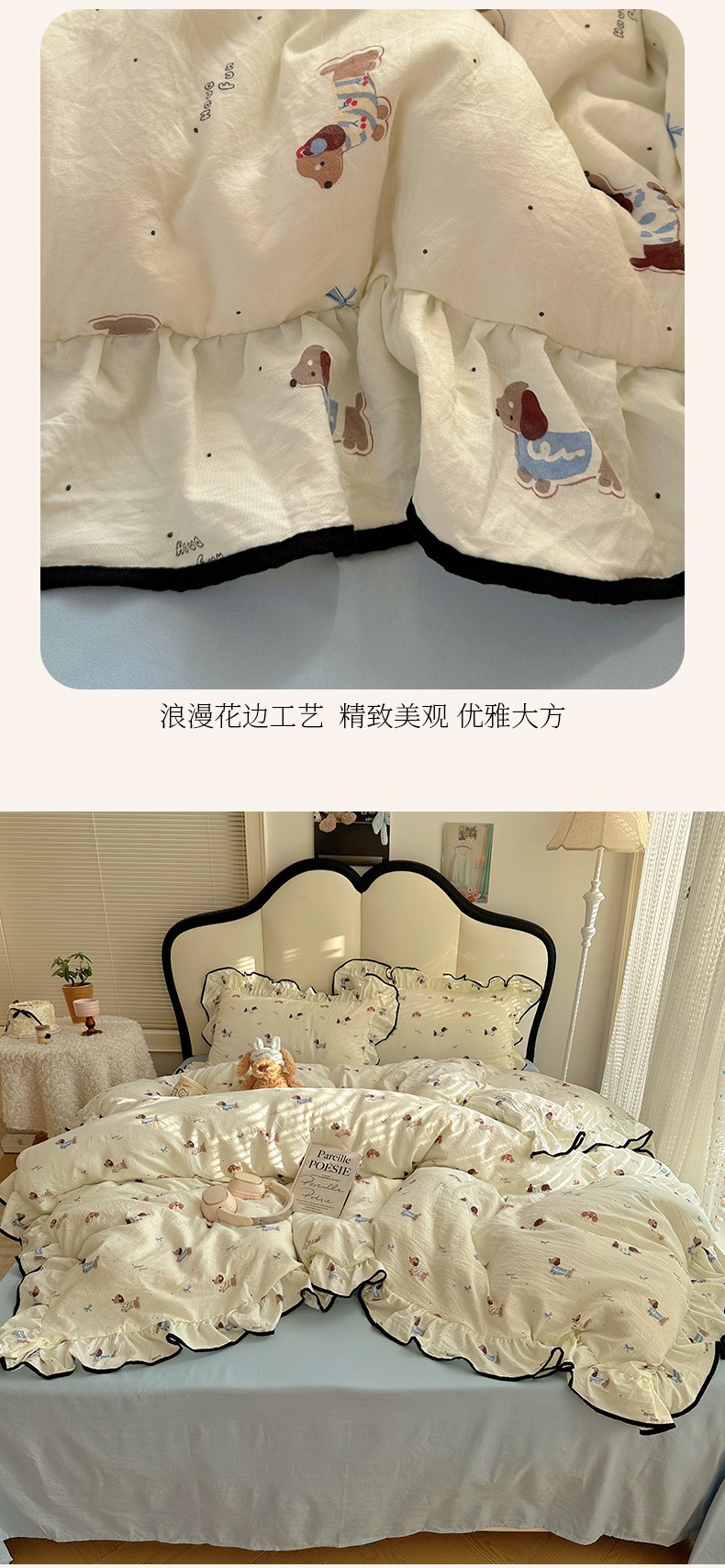 当前位置: 91家纺网 > 商品网购 > 床品套件 > 四件套 > 水洗棉四件套 > 韩巢家纺 2026新款水洗棉花边款四件套 可可腊肠犬【大花边款】