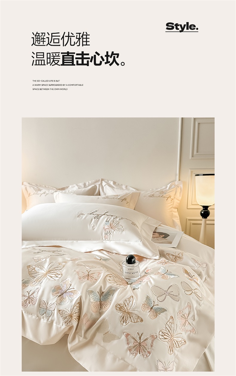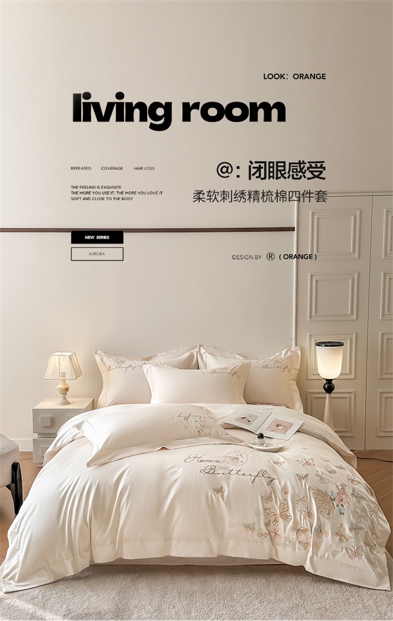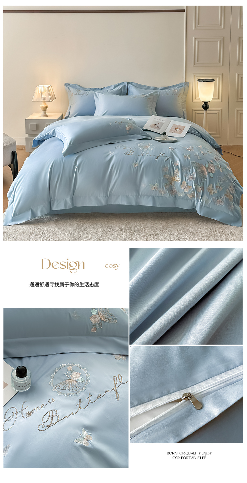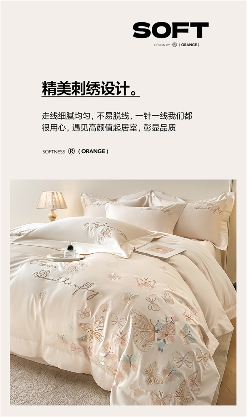 (总)金喜 2026新款柔软刺绣精梳棉四件套-梦蝶系列,梦蝶-月光白,梦蝶-繁星蓝,梦蝶-浅豆沙,梦蝶-香芋紫