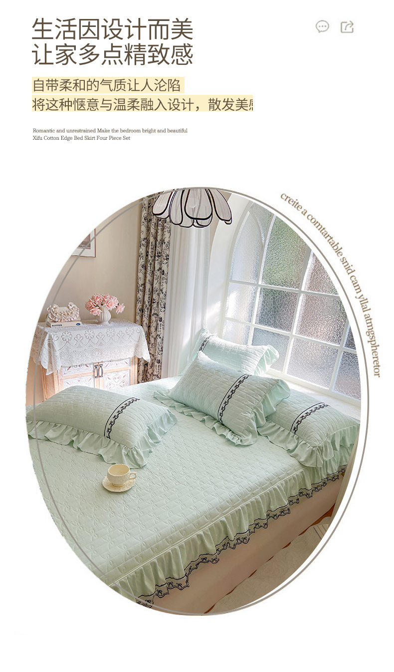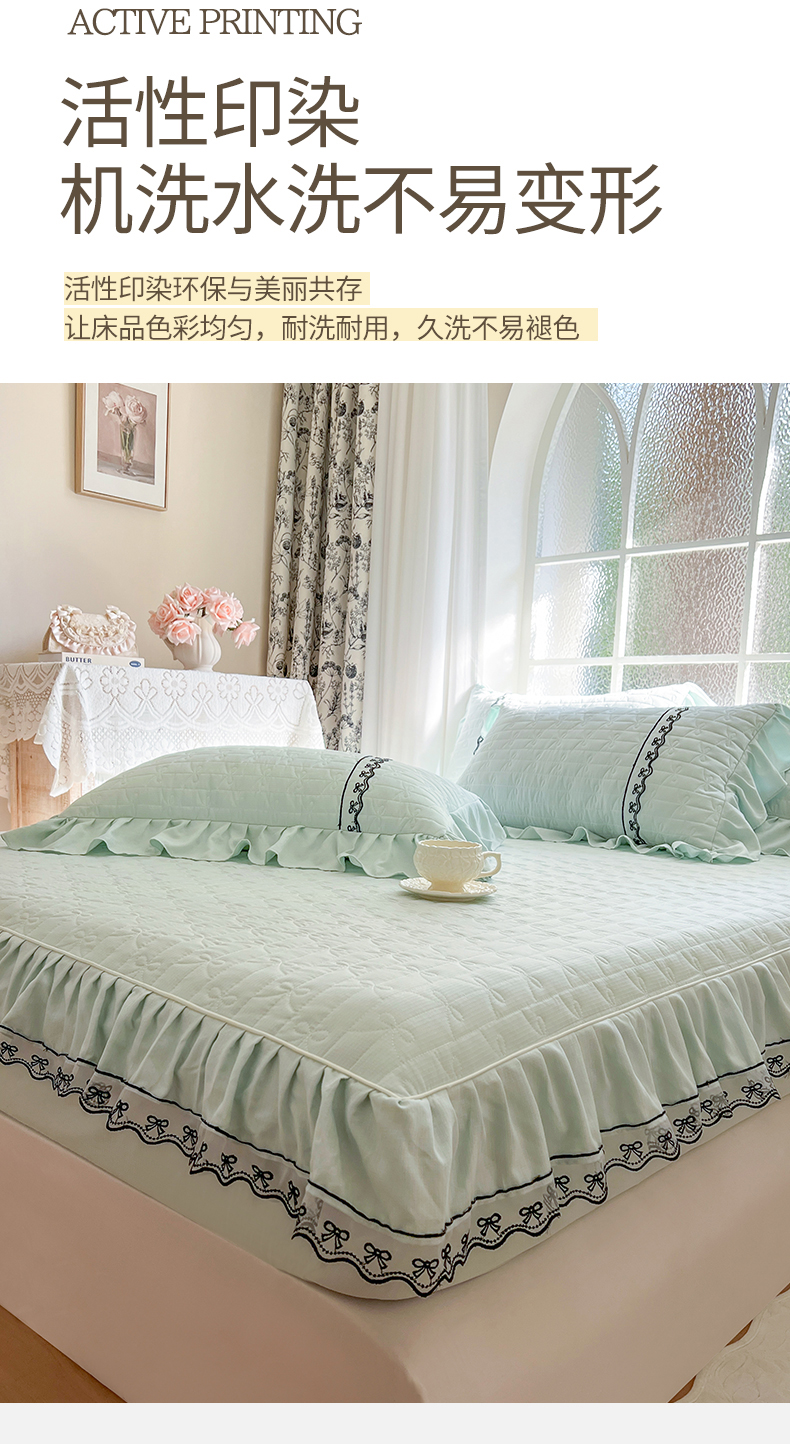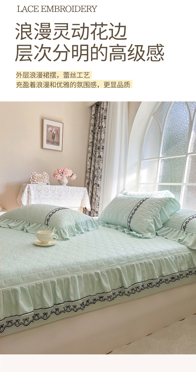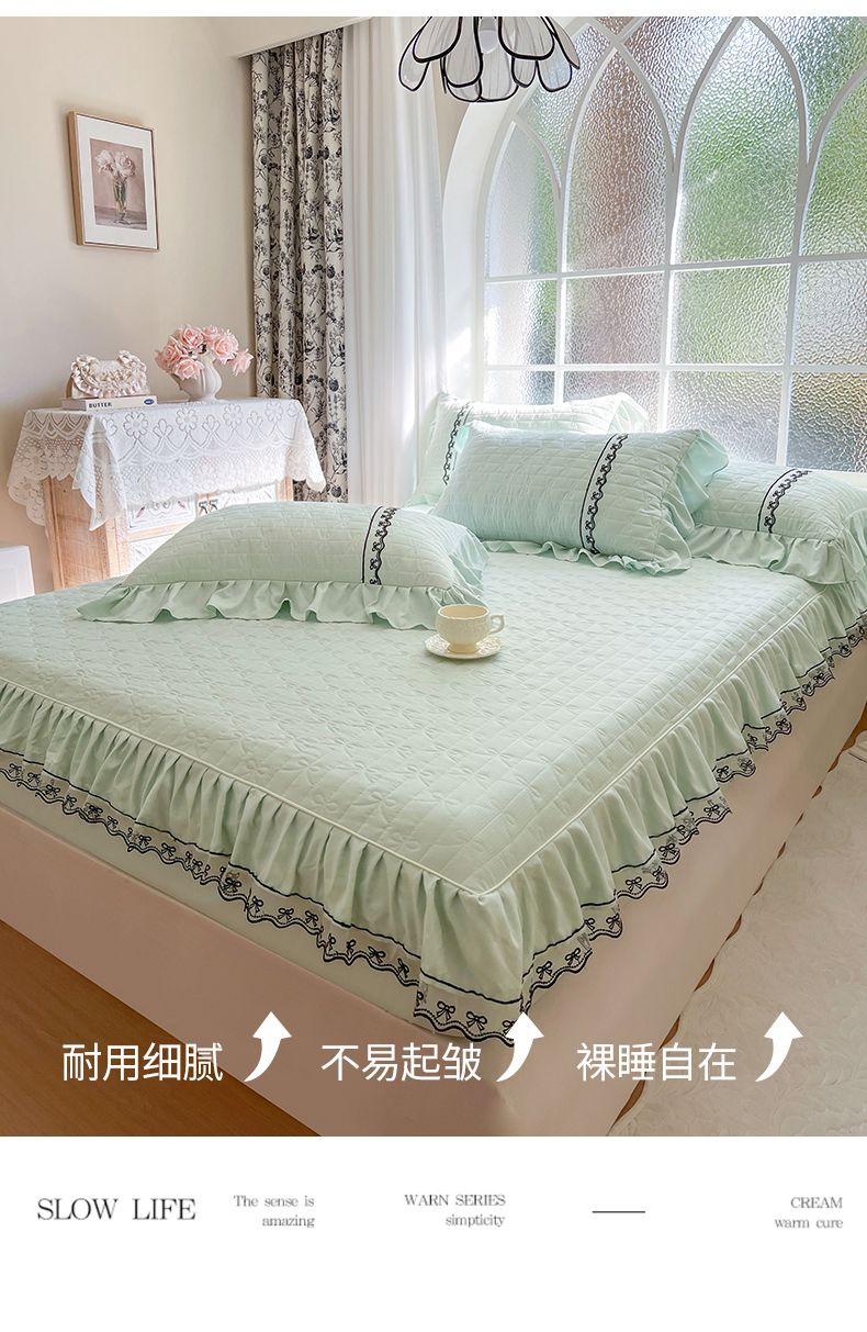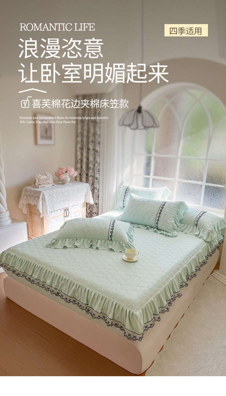 • 91家纺网 家纺一手货源 找家纺 网红馆(ck家纺) 2026新款喜芙棉蕾丝夹棉蜜芙蕾床笠 豆蔻绿
