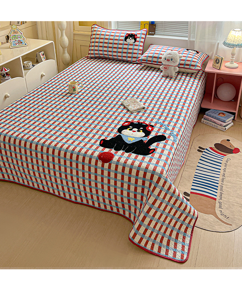 • 91家纺网 家纺一手货源 找家纺 鑫喜莱家纺 2026新款全棉纯棉原创毛巾绣床盖三件套单床盖软床垫 线团小黑猫