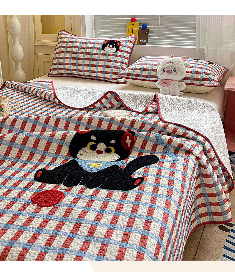 鑫喜莱家纺 2026新款全棉纯棉原创毛巾绣床盖三件套单床盖软床垫 线团小黑猫