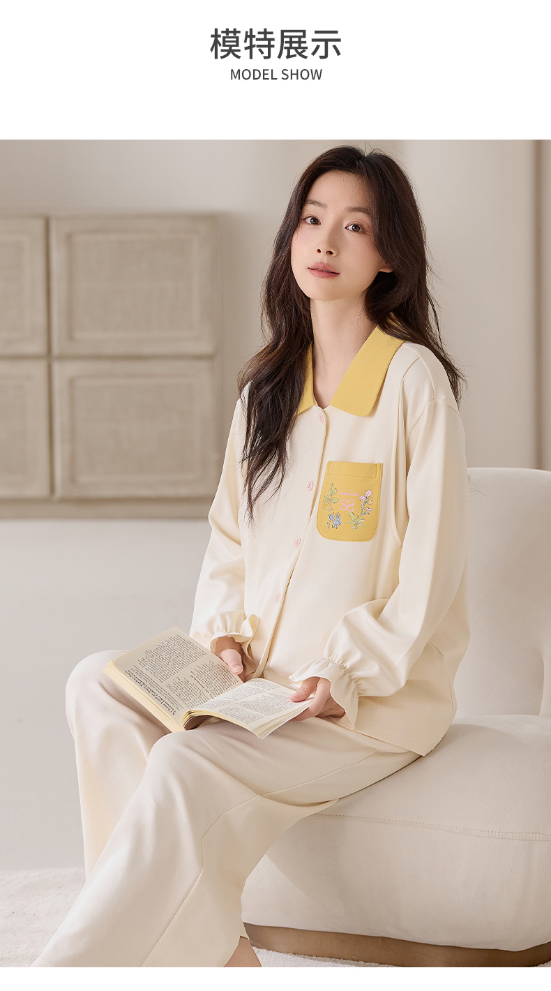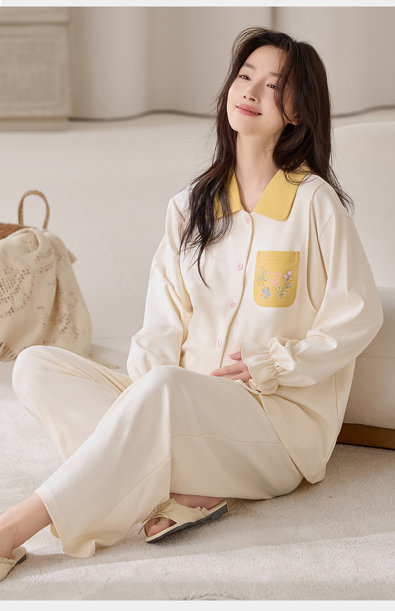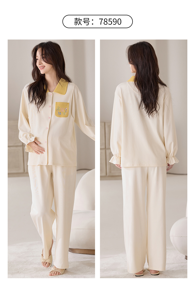 商品名称:洛兰沙家居馆 2026春秋季新款小清新针织全棉纯棉100%翻领开衫双长孕妇月子服睡衣女 翻领套装6