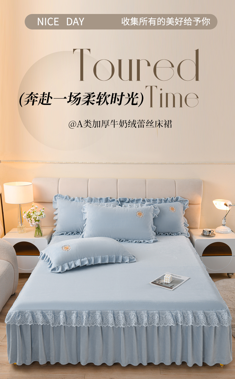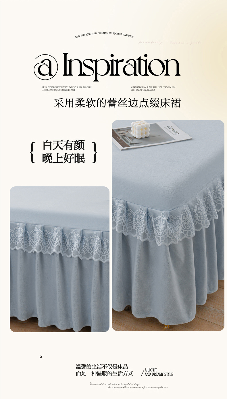 商品名称:优家居工厂店 2026新款240克高克重牛奶绒单件床裙韩版刺绣花牛奶绒床裙三件套 安娜-浅蓝