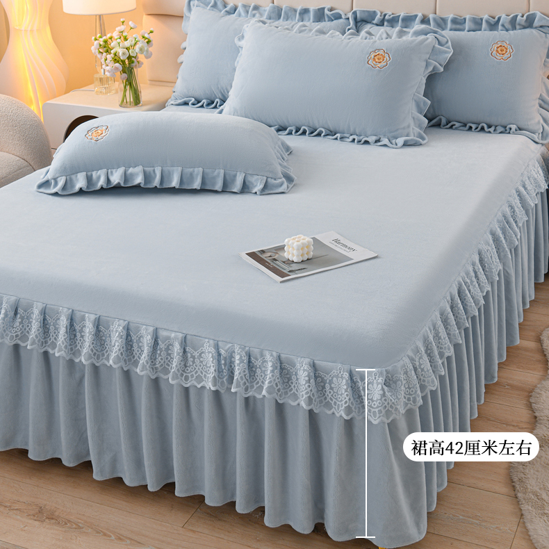 优家居工厂店 2026新款240克高克重牛奶绒单件床裙韩版刺绣花牛奶绒床裙三件套 安娜-浅蓝