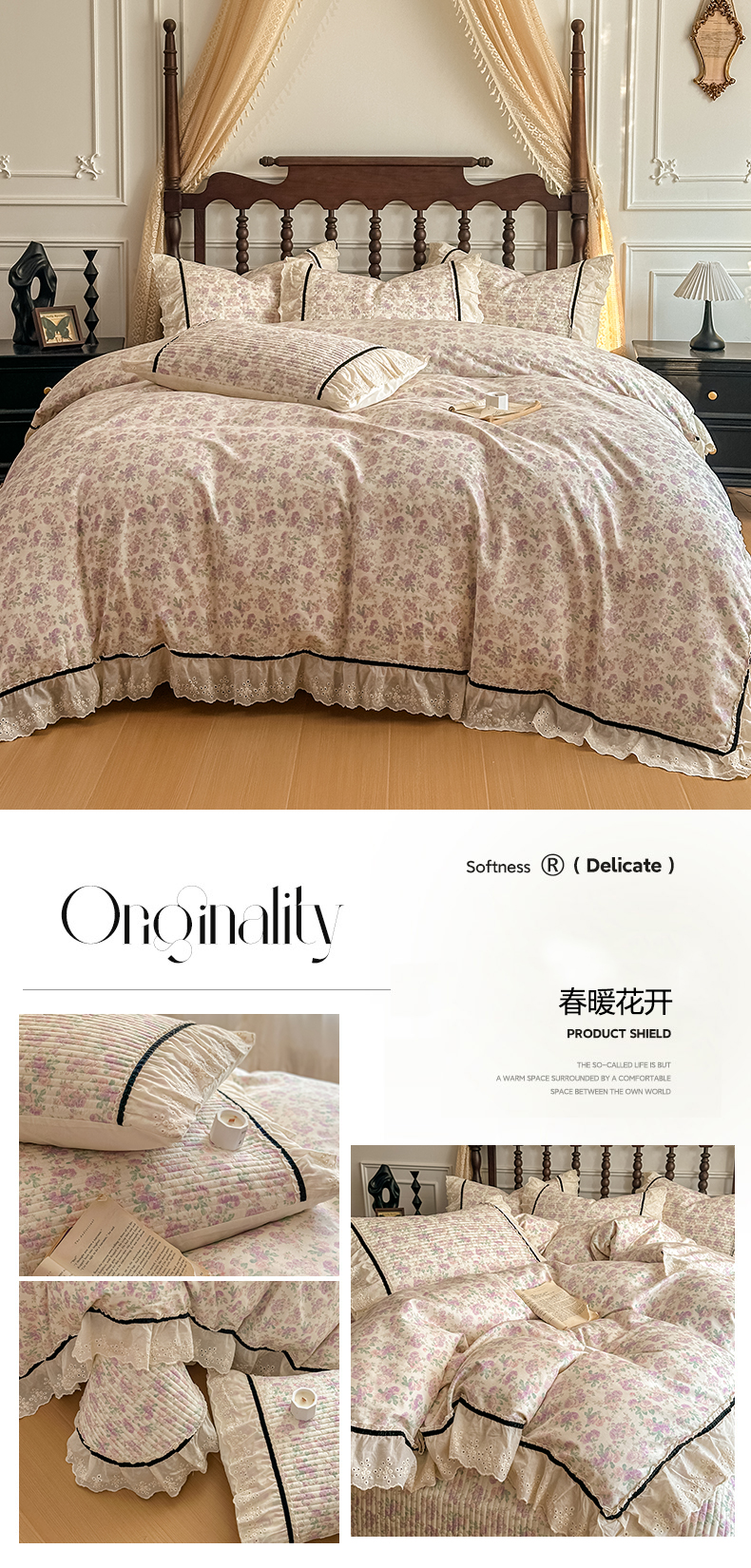 商品名称:美梦家纺 2026春夏新款全棉花边全棉床盖四件套系列 芊芊花海