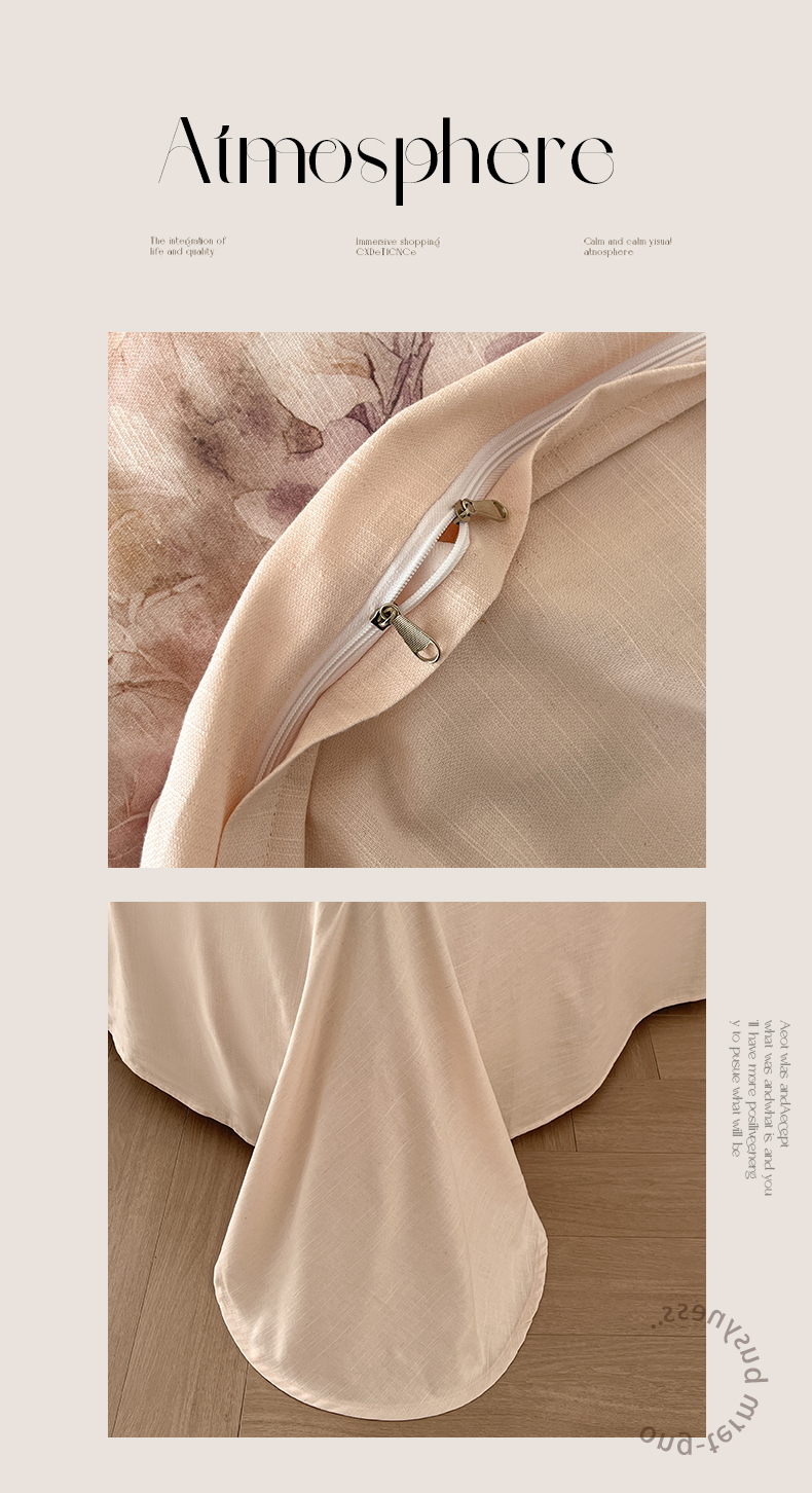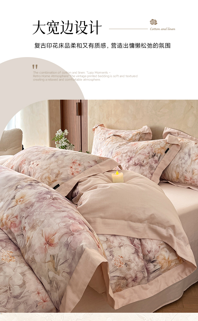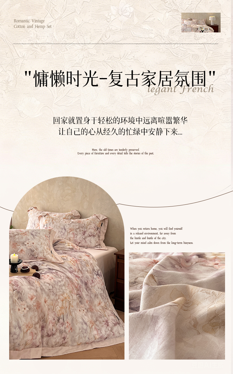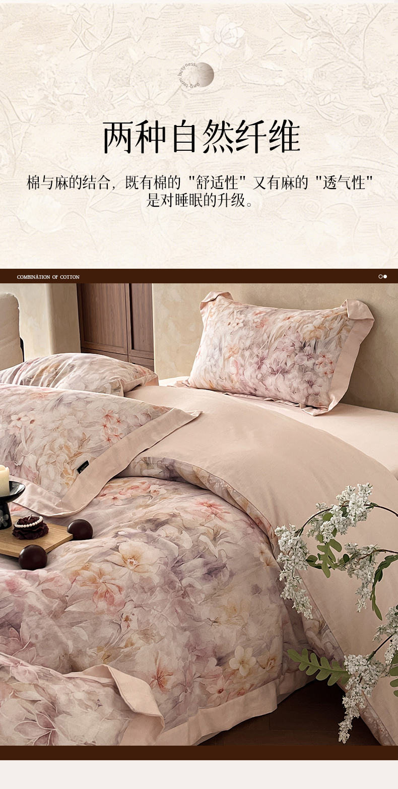 商品名称:金昱纺 2026新款拼角工艺款数码印花棉麻四件套 恋恋时光-紫