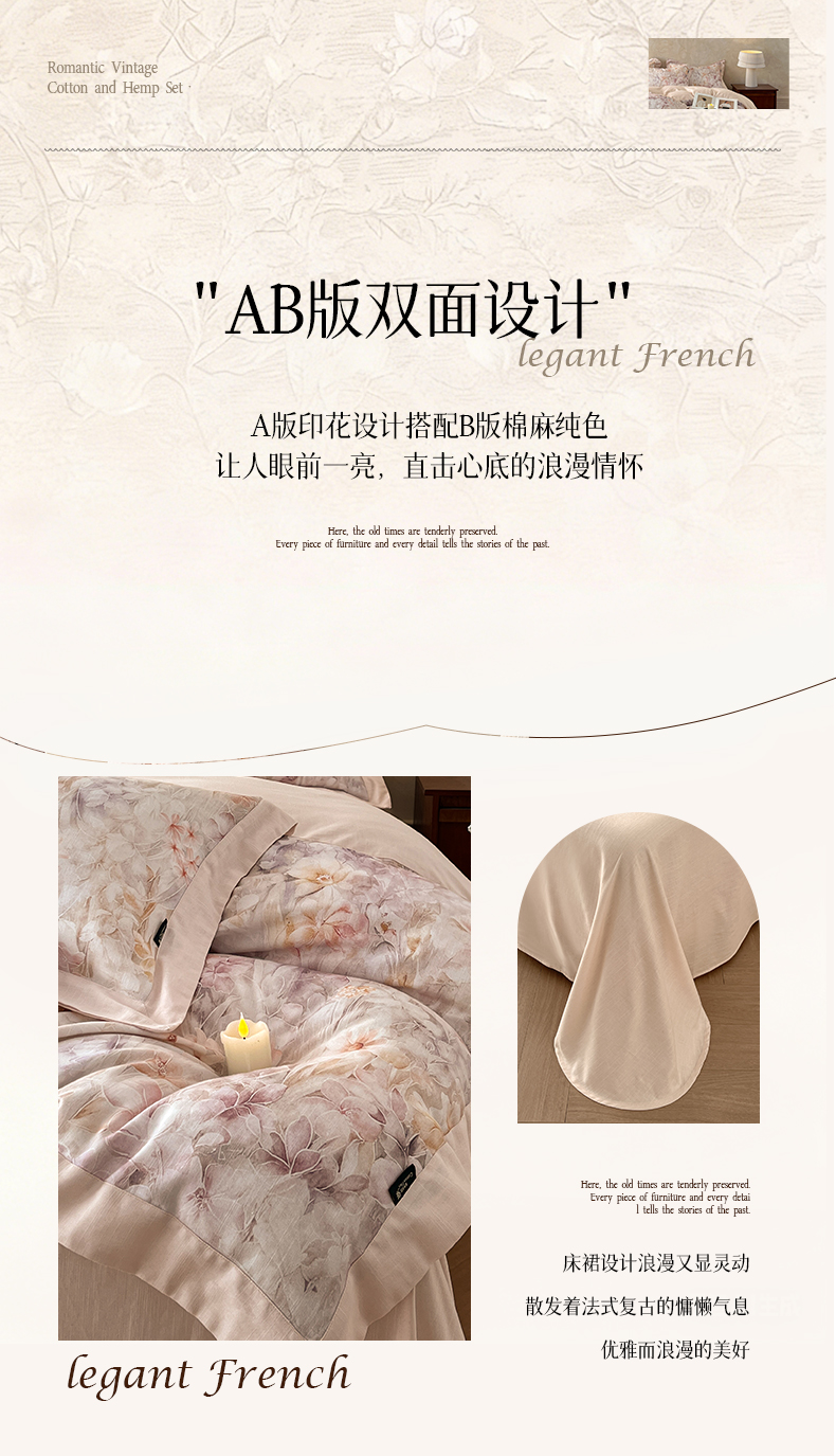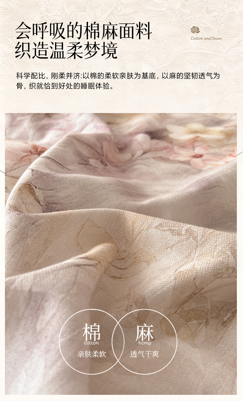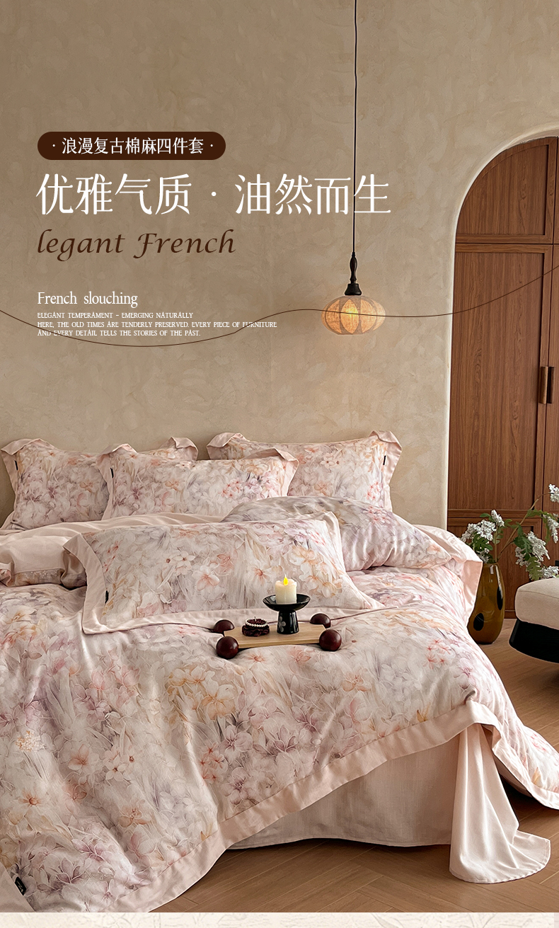 (总)金昱纺 2026新款拼角工艺款数码印花棉麻四件套,薇光-兰,布拉格-兰,辰梦-绿,恋恋时光-紫,梦幻巴黎-灰,岁晚-咖,万川-咖,叶璃-咖