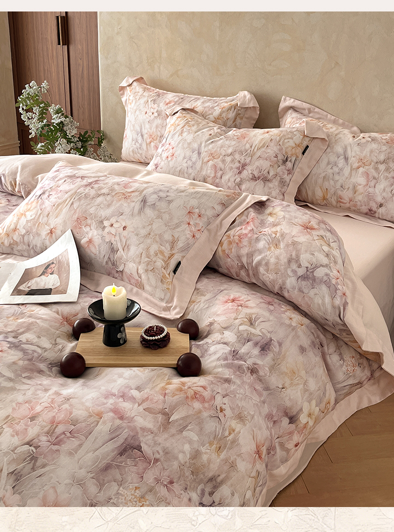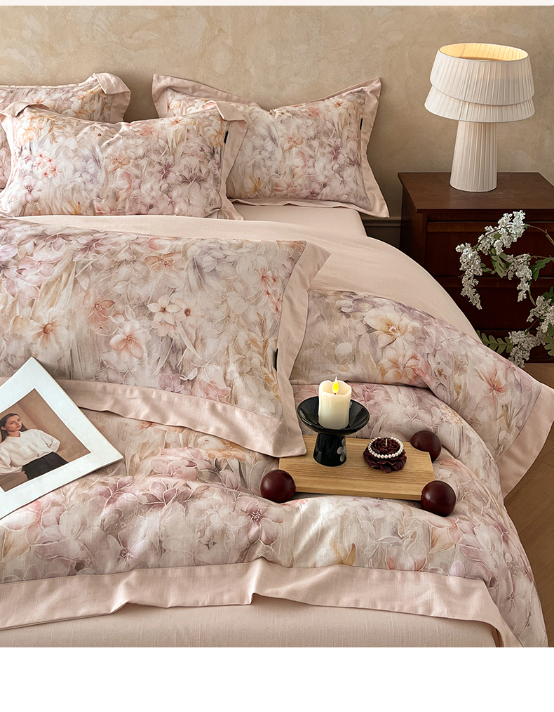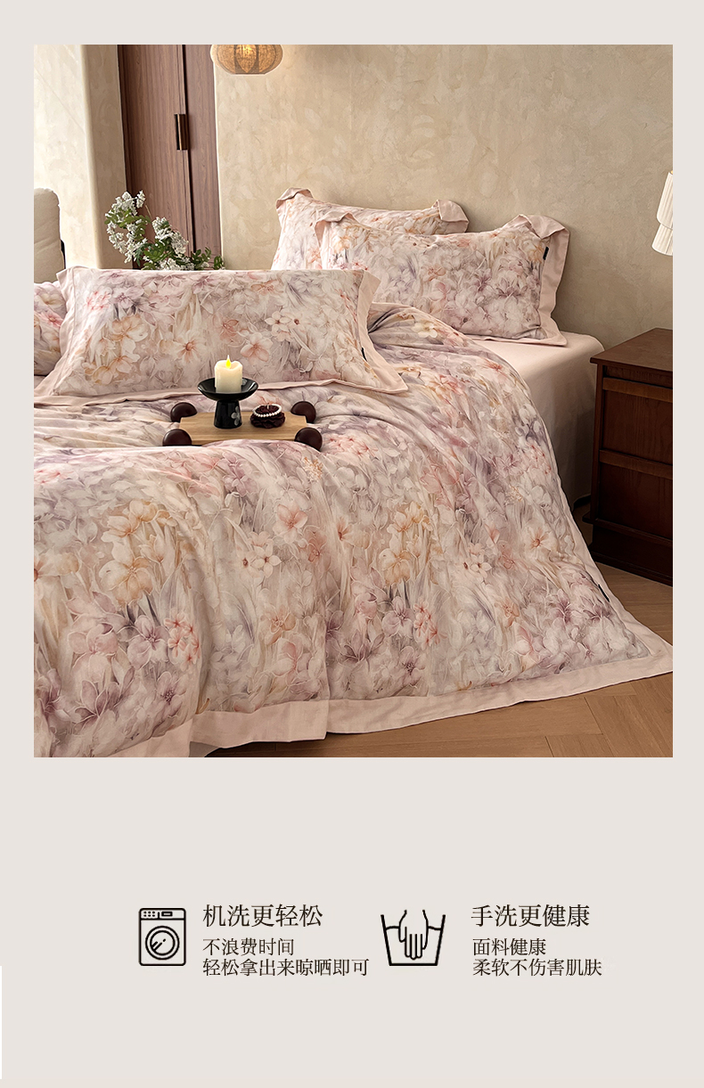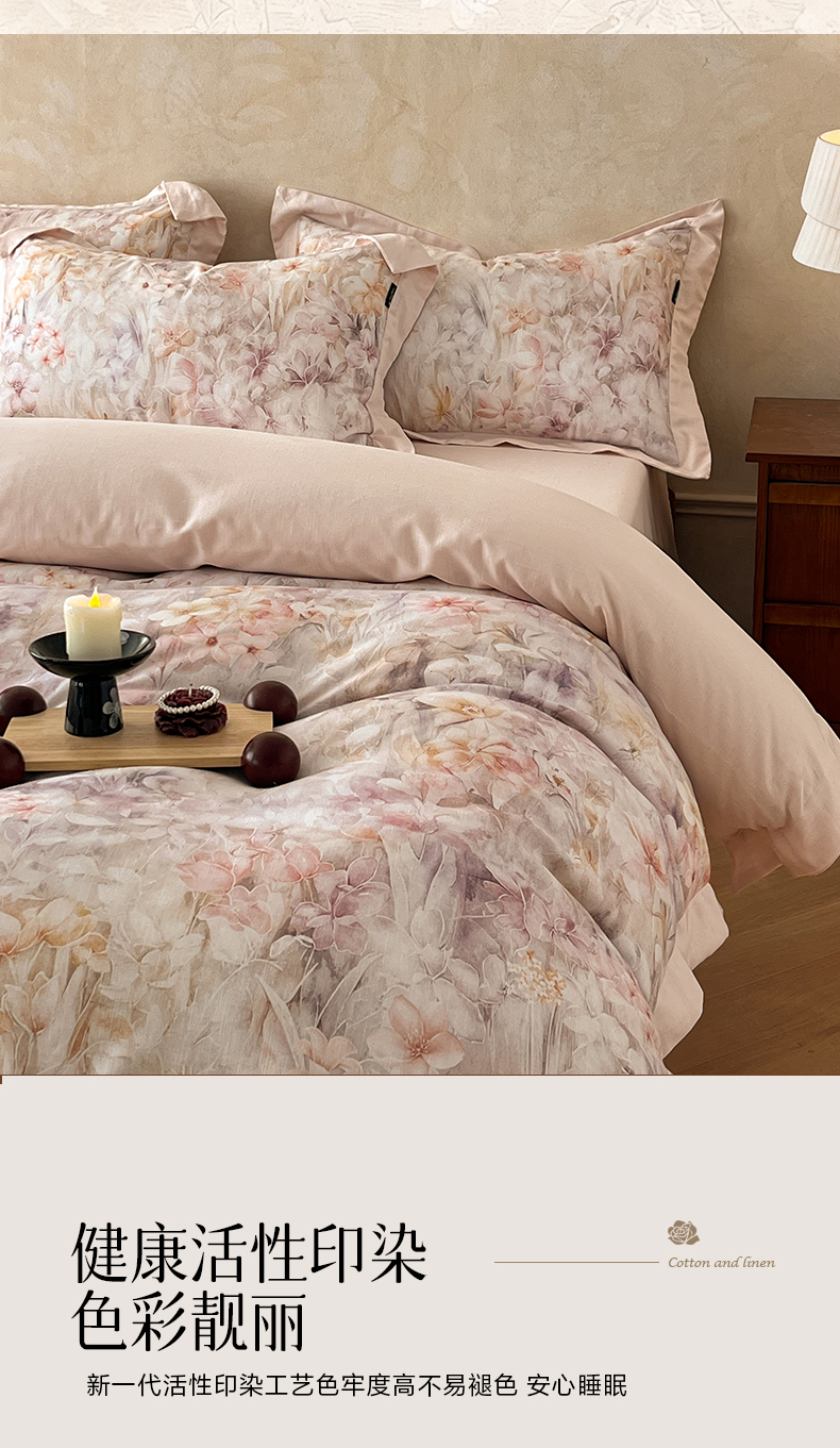金昱纺 2026新款拼角工艺款数码印花棉麻四件套 恋恋时光-紫
