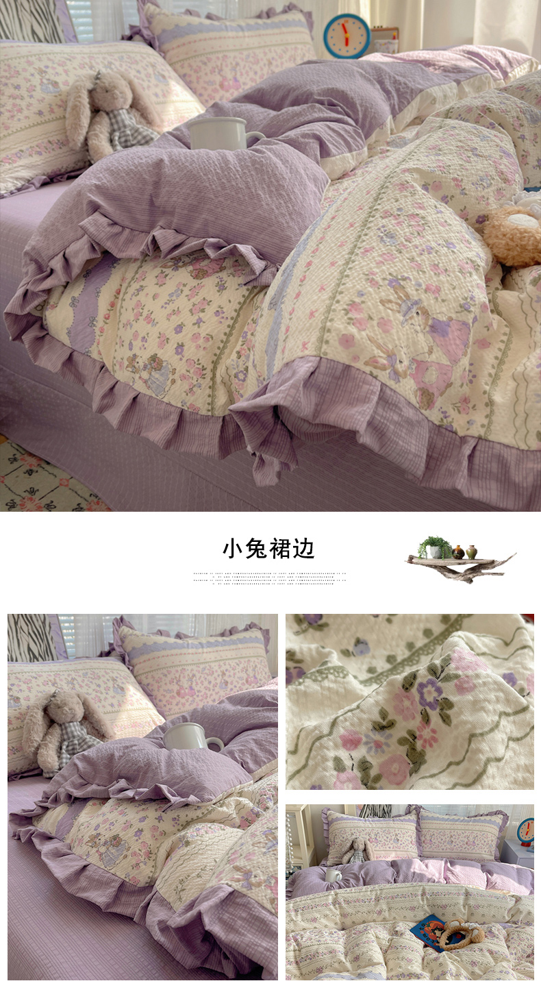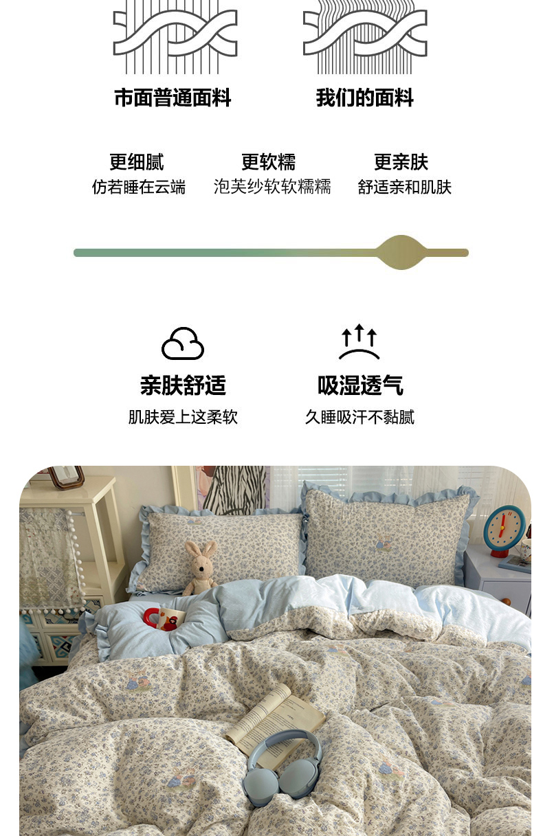 商品名称:迪梦姿家纺 2026新款高克重泡芙纱泡泡纱床单款四件套系列 兔仔花田