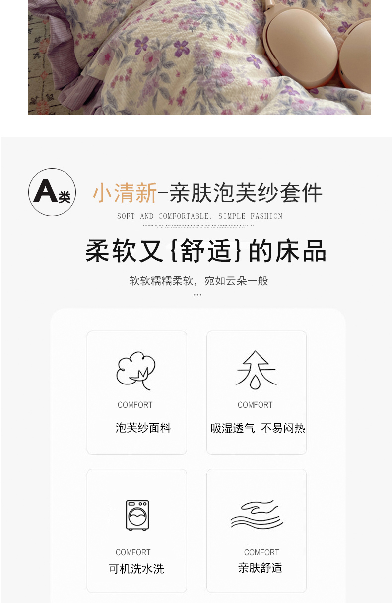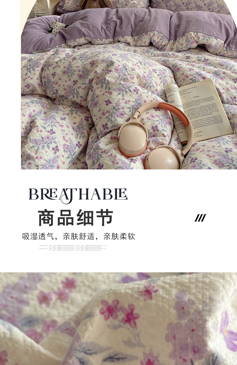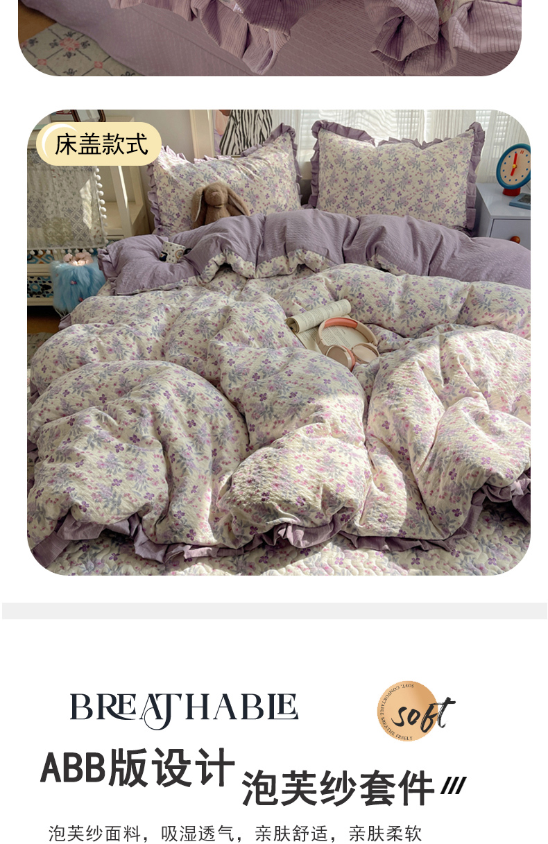 商品名称:迪梦姿家纺 2026新款高克重泡芙纱泡泡纱床单款四件套系列 紫雾花蝶集